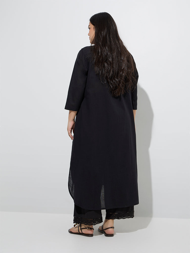 This black kurta from Diza is milled from a cotton-rich fabric and tailored in a breezy A-line silhouette for all-day comfort. Highlighting exquisite leaf embroidery for a touch of charm. it is styled with a collar that extends to a button placket and three-quarter sleeves. making it a graceful pick for ethnic wear.