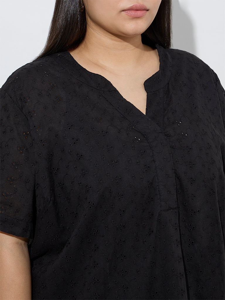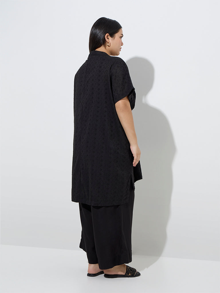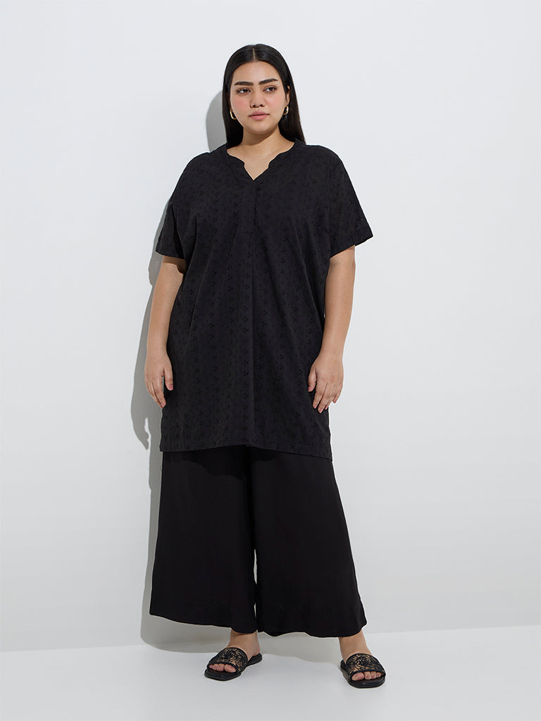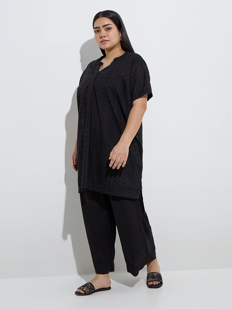 This black kurta from Diza exudes elegance with intricate schiffli detailing. Crafted from a soft cotton-rich fabric. it features a chic high-low silhouette. a notched neckline with a concealed button placket. and short sleeves for a timeless appeal.