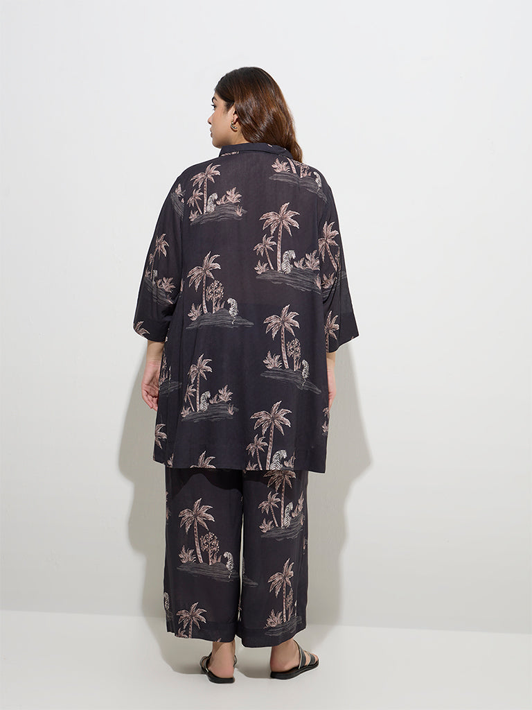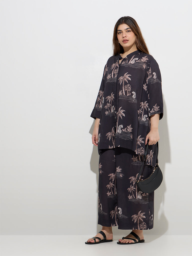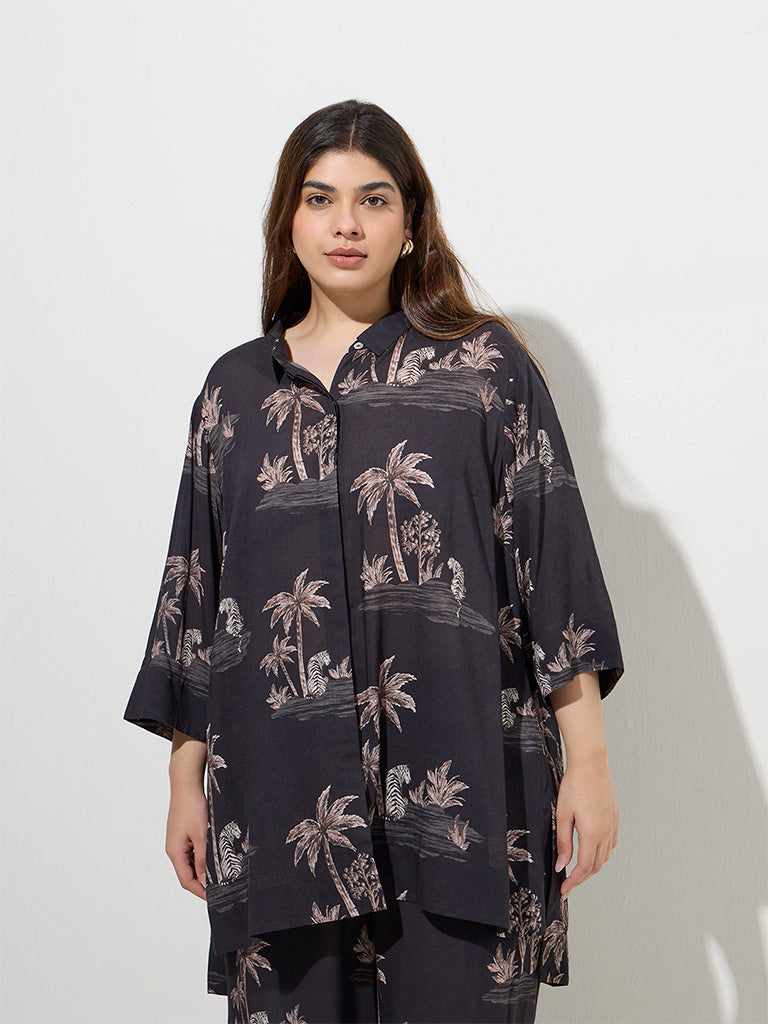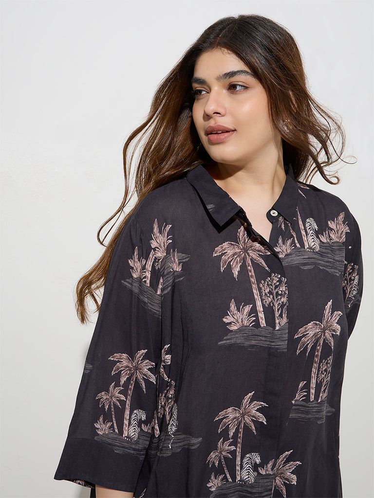 This black tunic from Diza is detailed with striking tropical prints for a bold yet breezy look. Milled from a lightweight fabric with a high-low hemline. it features a collar. a concealed button placket. and three-quarter sleeves for a refined finish.