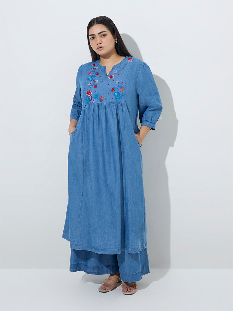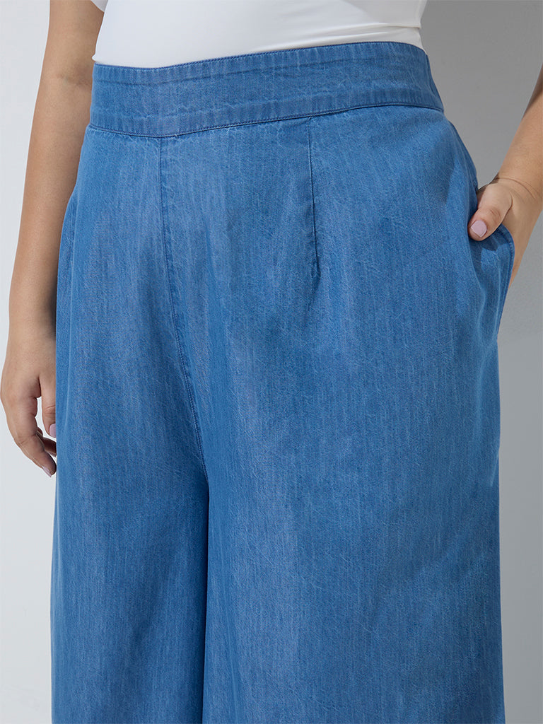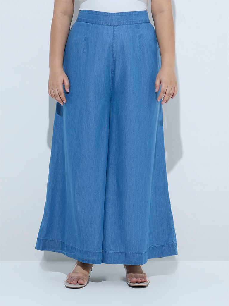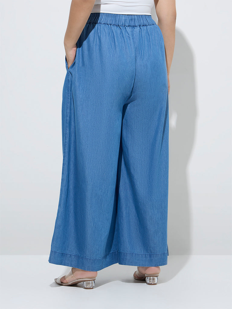 Diza introduces these blue denim palazzos. crafted from a soft cotton-blend fabric for all-day comfort. Designed with a mid-rise fit. they feature a smooth elastic waistband and functional side pockets.