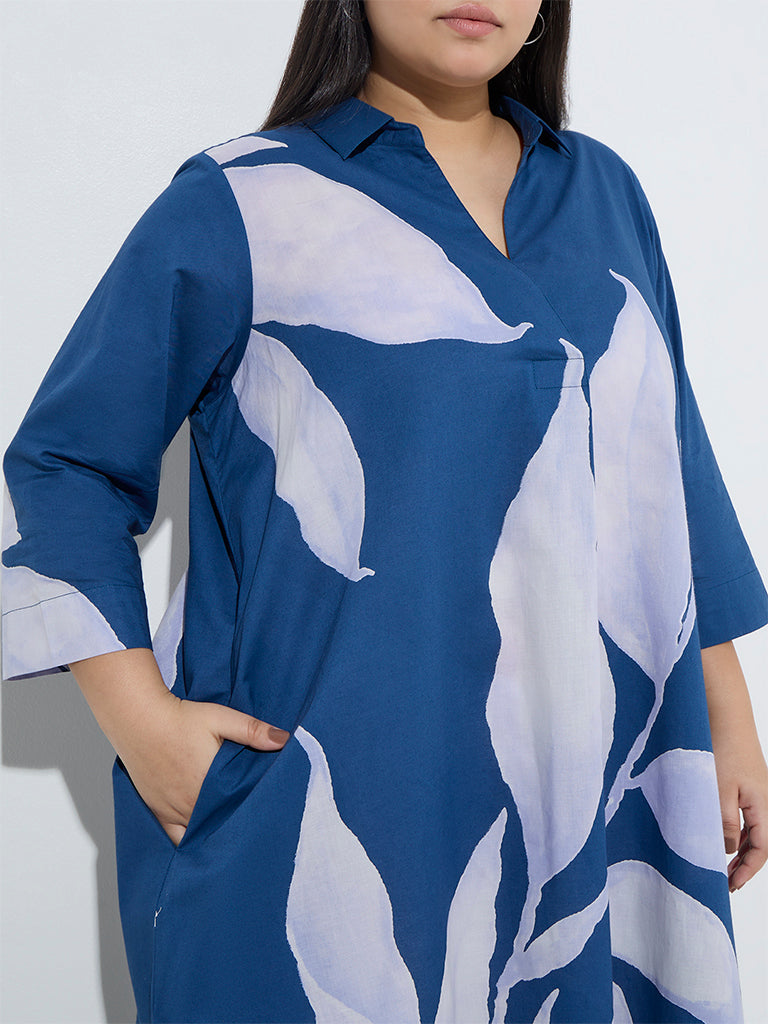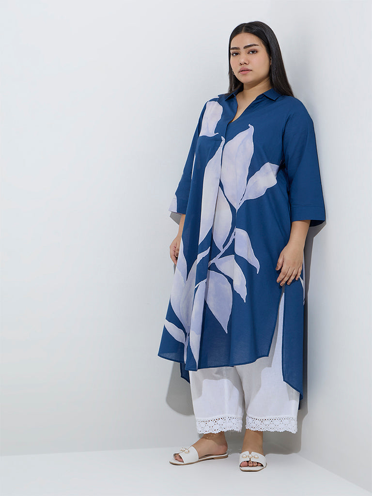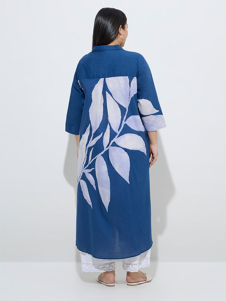 Diza Blue Leaf Design High-Low Cotton Kurta
