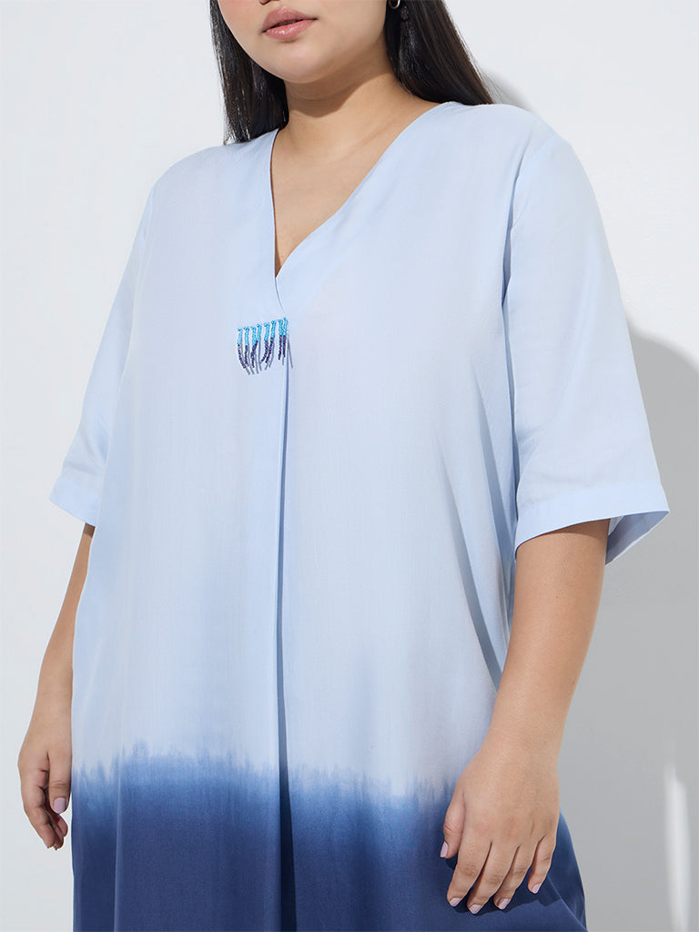This blue kurta by Diza is crafted from a breathable fabric for all-day comfort. Showcasing a striking ombre finish. it features a V-neck with tassel accents. three-quarters sleeves. and functional side pockets for effortless style and practicality.