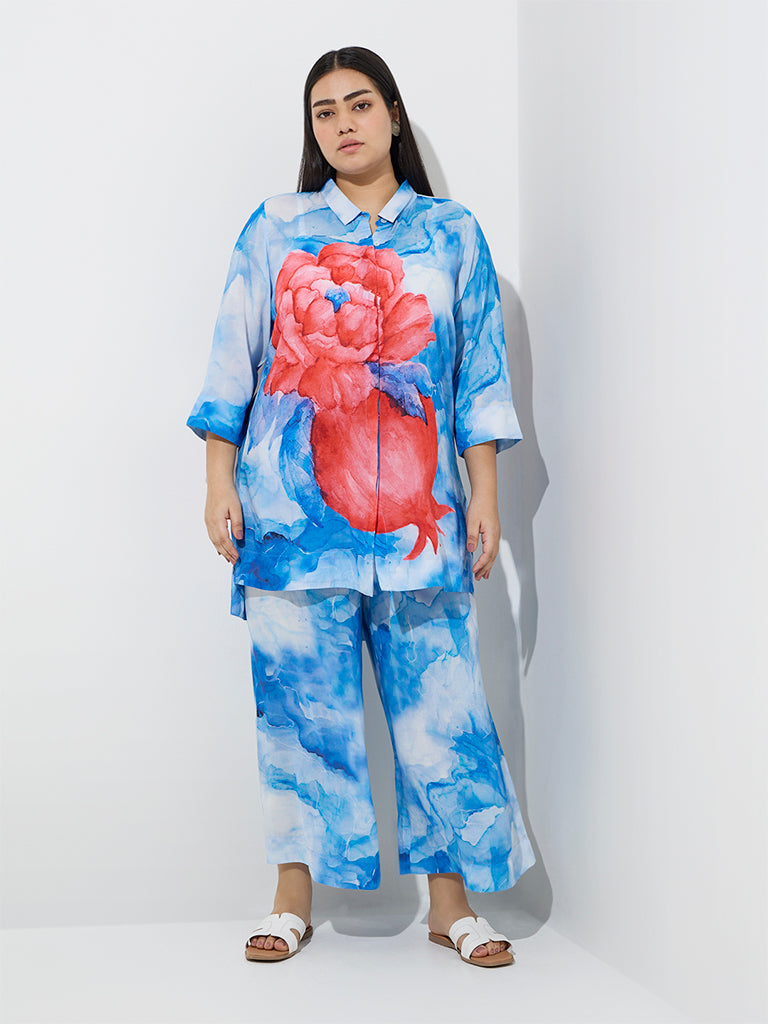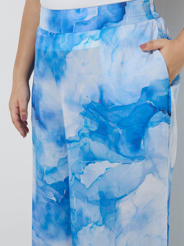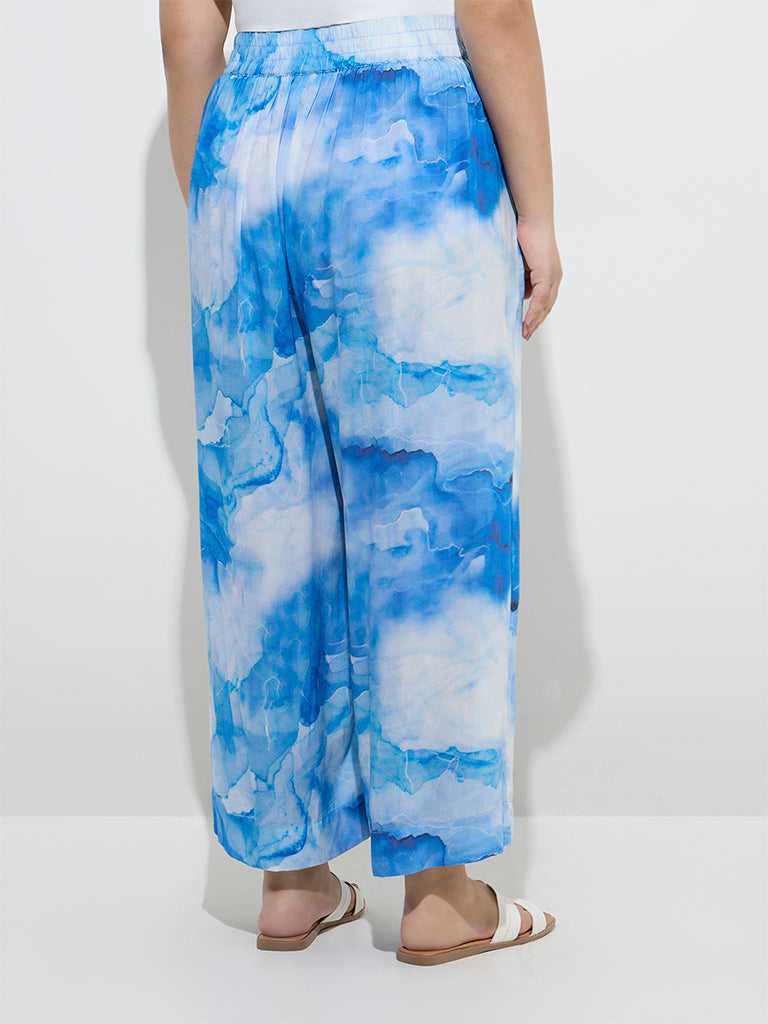 These blue high-rise pants from Diza showcase a captivating tie-dye design for a stylish edge. Crafted from sumptuous fabric. they feature a smooth elastic waistband and functional side pockets. blending comfort with effortless charm.