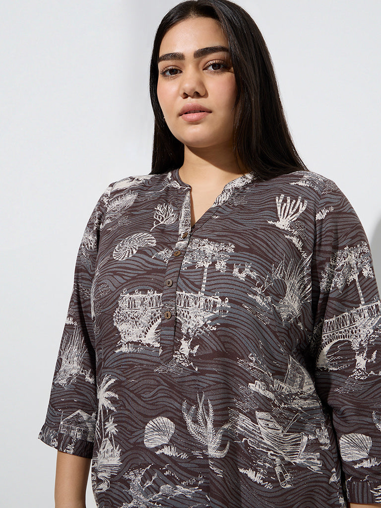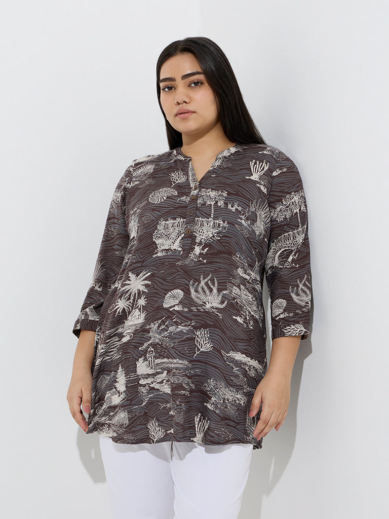 Diza launches this brown ethnic kurti. spun from a lightweight fabric for effortless daytime dressing. Showcasing scenic prints all over. it is designed with a mandarin neck. a brief button placket. and three-quarter sleeves. blending classic details with comfortable style.