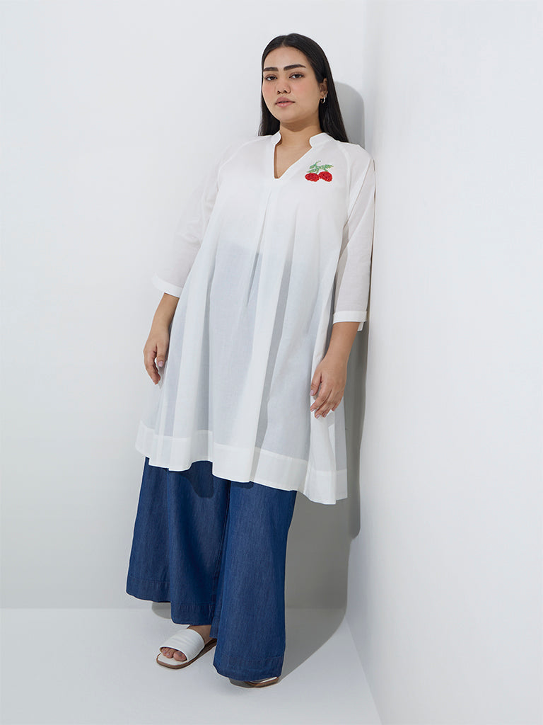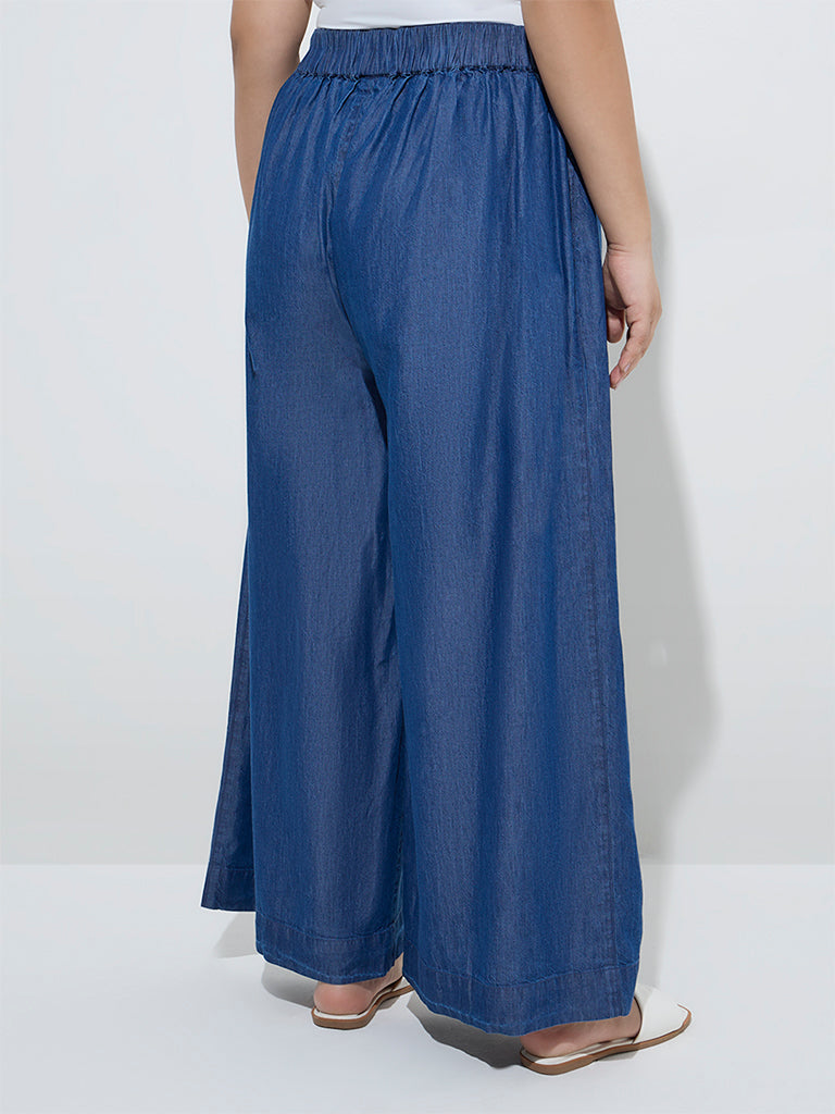 Diza unveils these dark blue denim palazzos. tailored from a cotton-blend fabric for a soft yet structured feel. Featuring a mid-rise silhouette. they are designed with a smooth elastic waistband and side pockets.