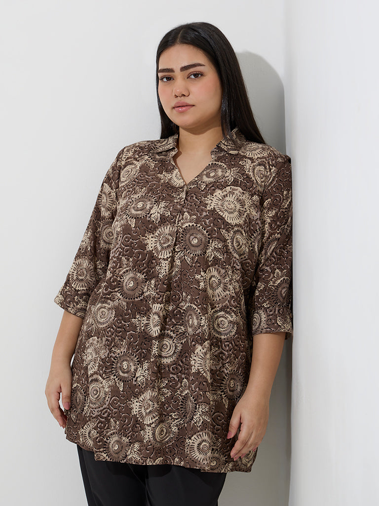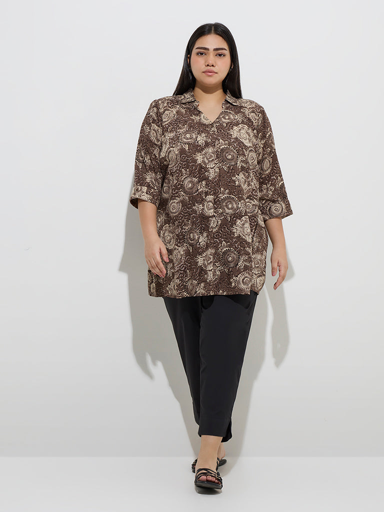 This dark brown tunic from Diza brings earthy elegance to your everyday wardrobe. Milled from a breathable fabric. it features whimsical fruit-inspired prints that add a hint of charm. The V-neck collar with a single button closure and three-quarters sleeves complete the look with a contemporary flair.