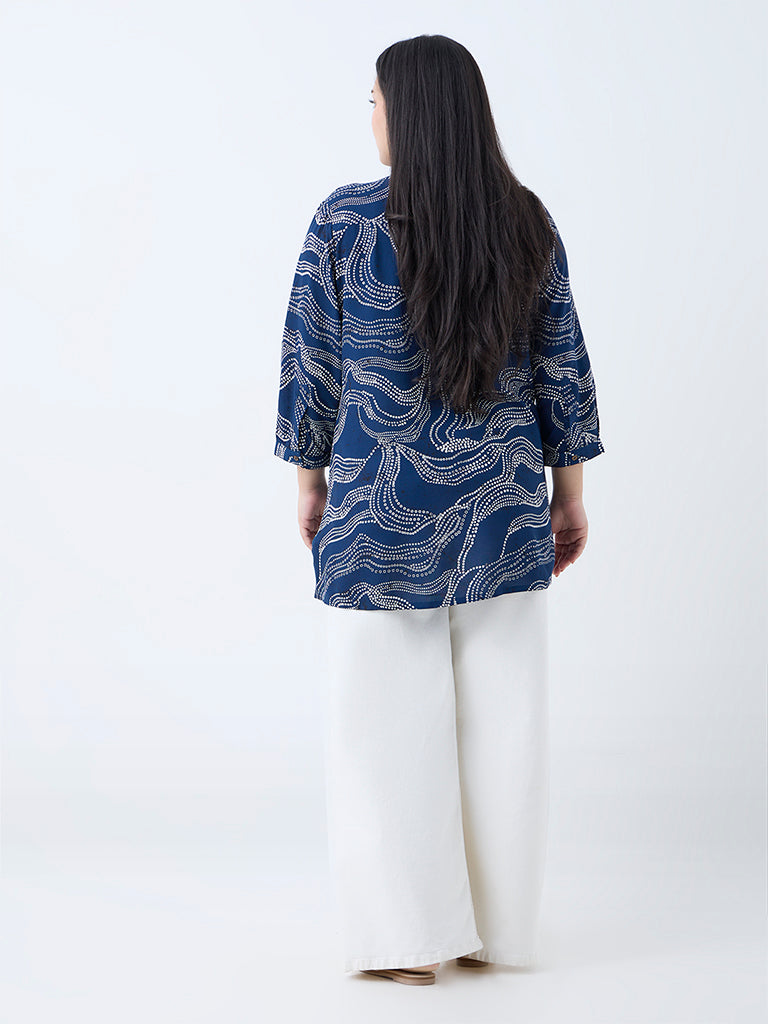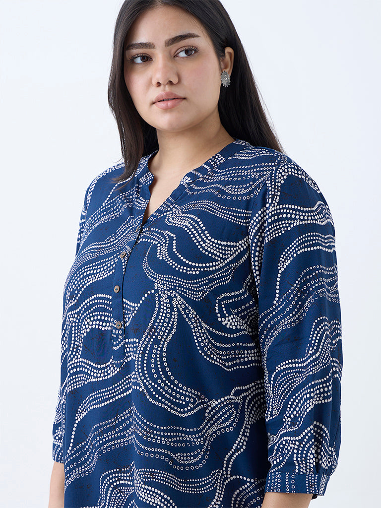 This indigo tunic from Diza showcases an all-over bandhani print that blends traditional charm with everyday ease. Designed with a notched neckline. a button placket and three-quarter sleeves. it’s a versatile pick for effortless day dressing.