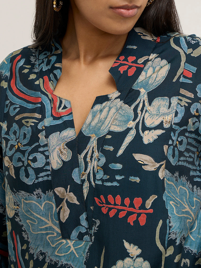 Diza presents this indigo kurta boasting botanical prints. Constructed from a lightweight fabric in an A-Line silhouette. it includes an asymmetrical neckline and three-quarter sleeves.