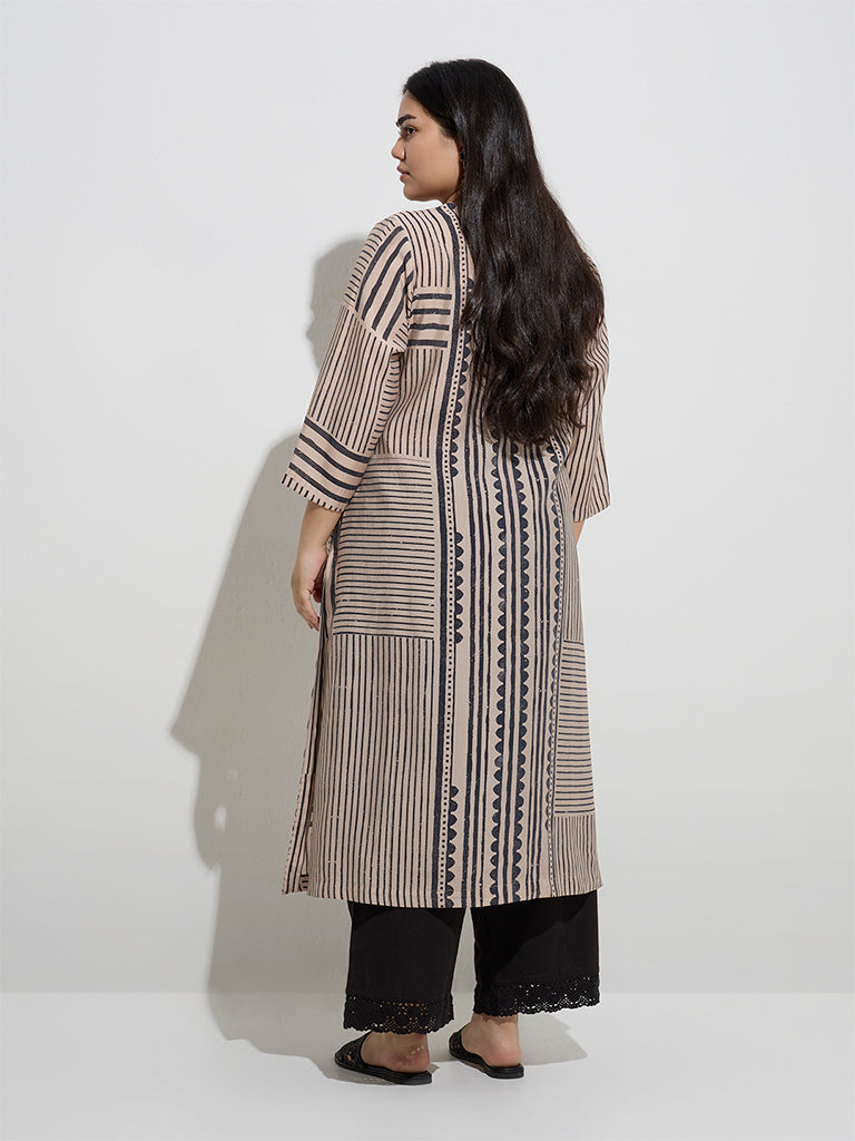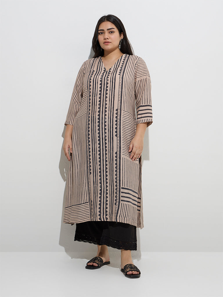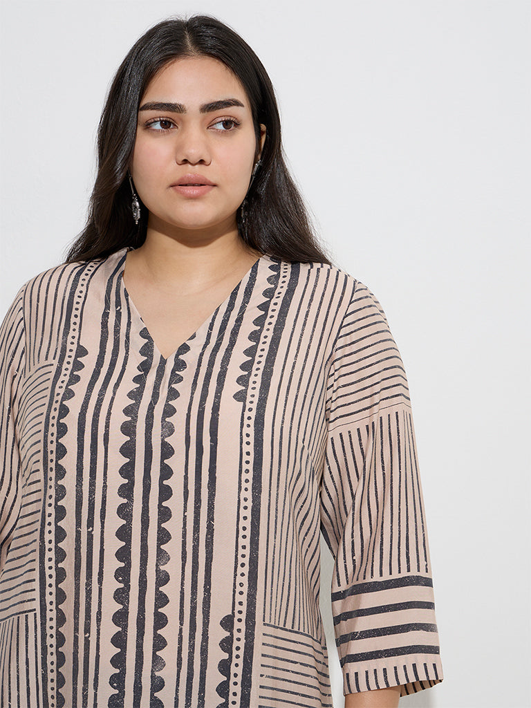 This light beige kurta from Diza is tailored in an A-line silhouette from soft. breathable fabric. It features a V-neck and three-quarter sleeves. while functional side pockets enhance its practicality for effortless everyday wear.