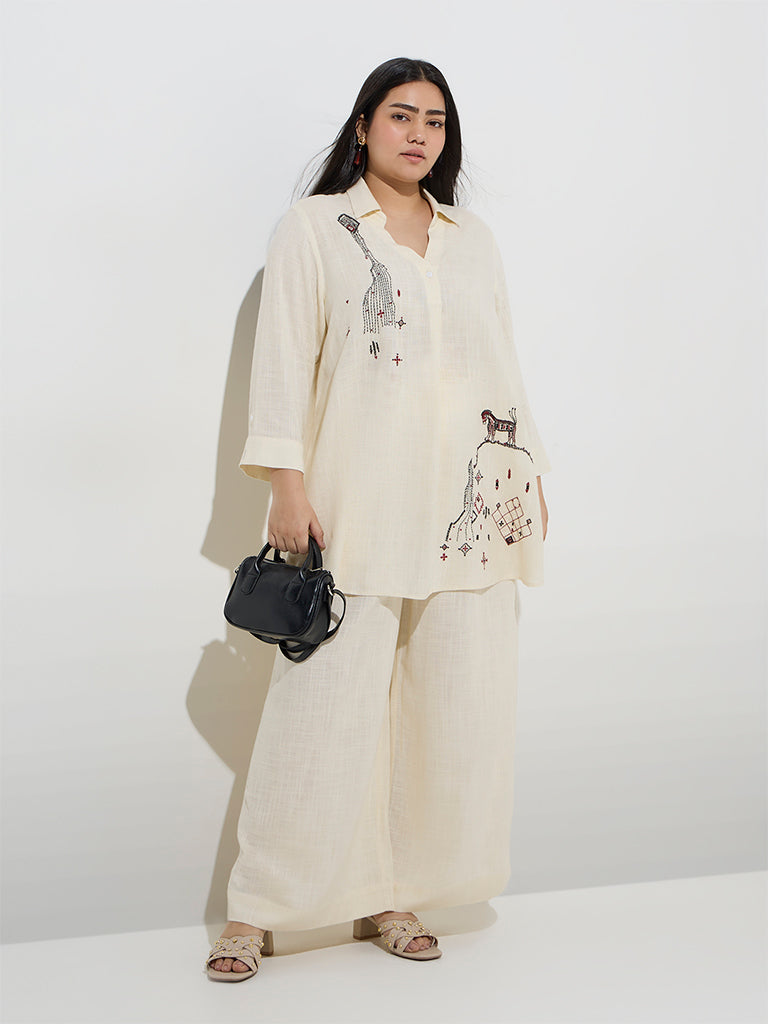 These light beige palazzos from Diza are a versatile wardrobe staple. Tailored from a luxurious linen-blend fabric. they feature an elasticated waistband for a secure fit and a flowy silhouette that drapes beautifully.