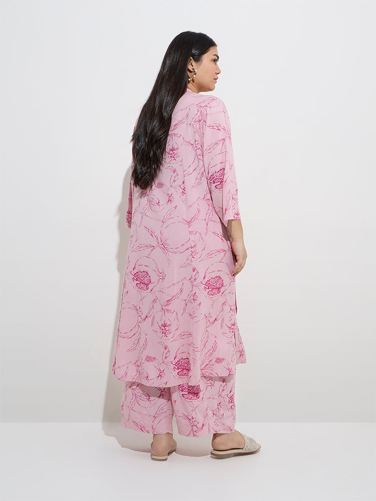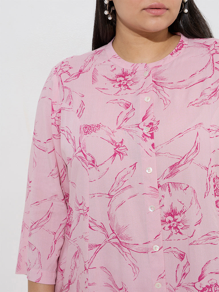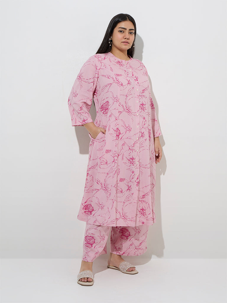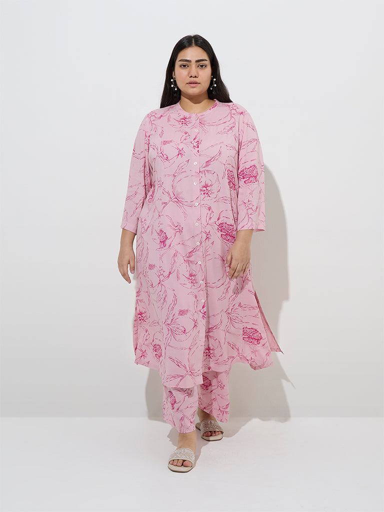 This light pink kurta from Diza is designed with a band neck. a button-up front and three-quarter sleeves. Woven from pure cotton. this structured ethnic wear is finished with functional side pockets. making this a timeless addition to your everyday wardrobe.