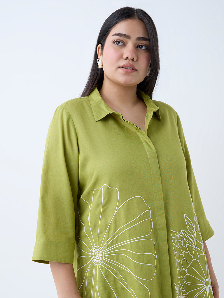 This lime ethnic tunic from Diza is defined with floral embroidery that amplifies its minimal base. Made from a breathable fabric for easy comfort. it is styled with a crisp collar. a concealed button placket and three-quarter sleeves for a breezy fit.