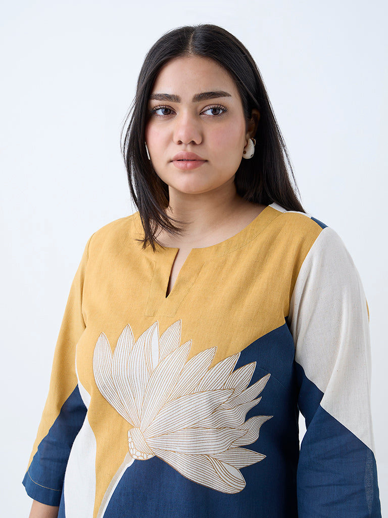 Fashioned in an elegant A-line silhouette. this multicolour kurta from Diza is milled from a premium cotton-blend fabric that moves with ease. Showcasing floral motifs at the front. it is finished with a split neck and three-quarter sleeves. A concealed slip pocket adds functionality without disrupting the flow.
