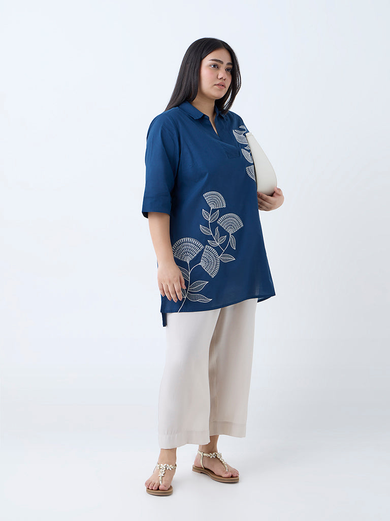 This navy tunic from Diza is brought to life with vivid floral embroidery that draws the eye to the front panel. Cut from pure cotton. it’s designed for breathability and all-day ease. The collared neck and three-quarter sleeves offer a balanced frame. while the high-low hem adds a graceful touch of drama to the relaxed silhouette.