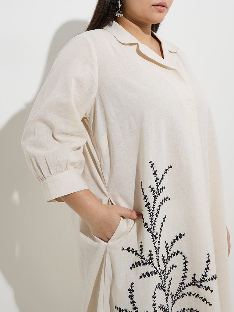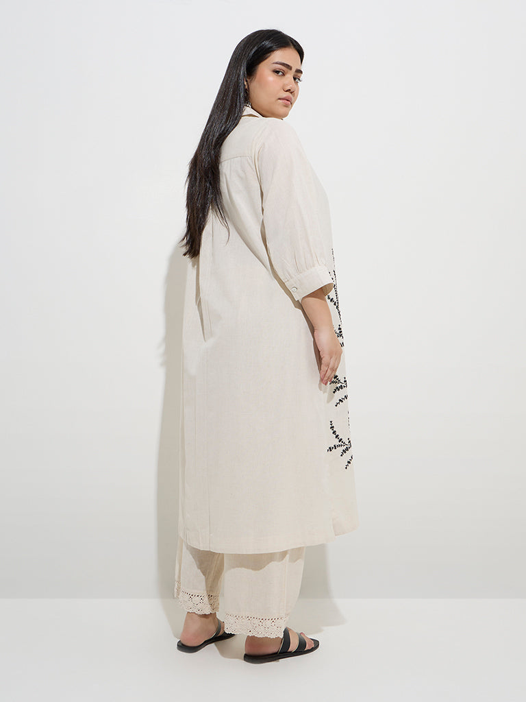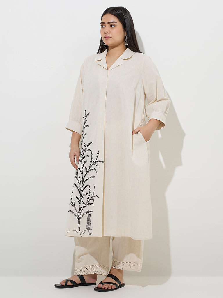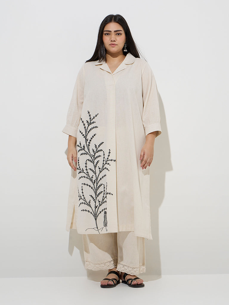 This off-white kurta from Diza is woven from a rich cotton-linen blend and showcases elegant botanical-inspired embroidery for a refined touch. Shaped in a fluid A-line silhouette. it is designed with a notched collar and three-quarters sleeves. while the inclusion of slip pockets adds a note of everyday practicality to its graceful appeal.