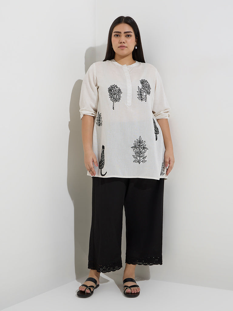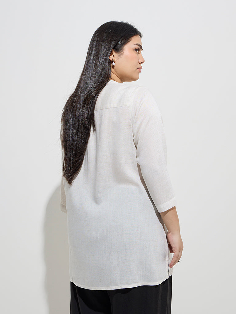 This off-white kurti from Diza is constructed from a rich cotton-linen blend for breathable comfort. Adorned with intricate embroidery. it features a mandarin collar that flows into a concealed button placket. while the three-quarter sleeves lend a balance of relaxed style and refined detailing.