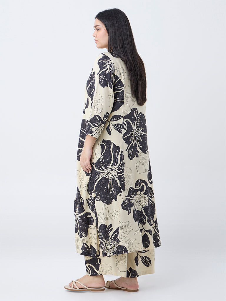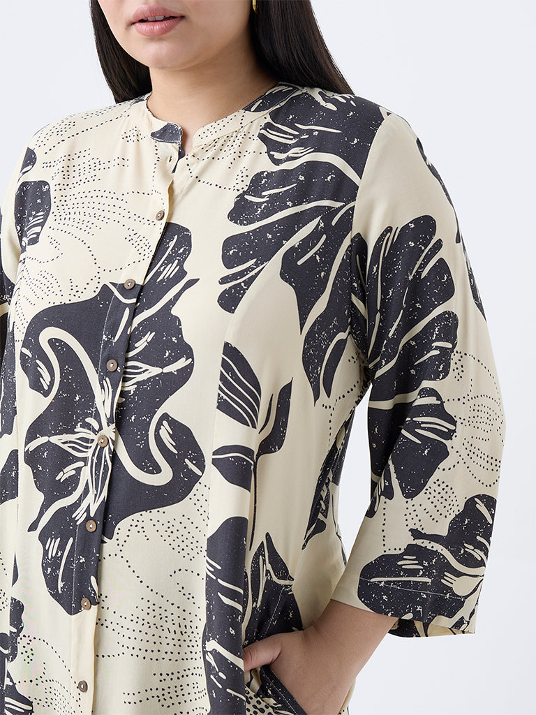 This off-white A-line kurta from Diza showcases a floral print in a contrasting hue for a graceful yet modern appeal. Designed with a band collar and button-down front. it features three-quarter sleeves and convenient side pockets. an elegant choice for effortless everyday style.