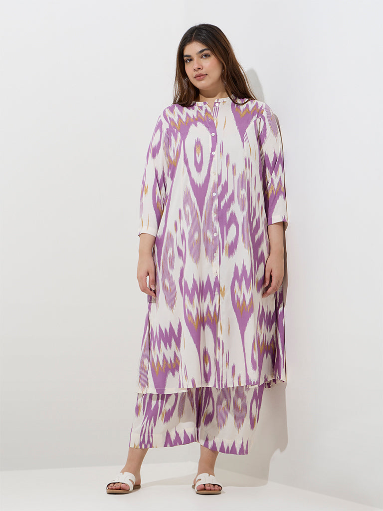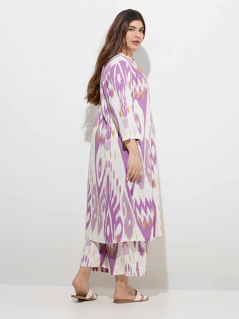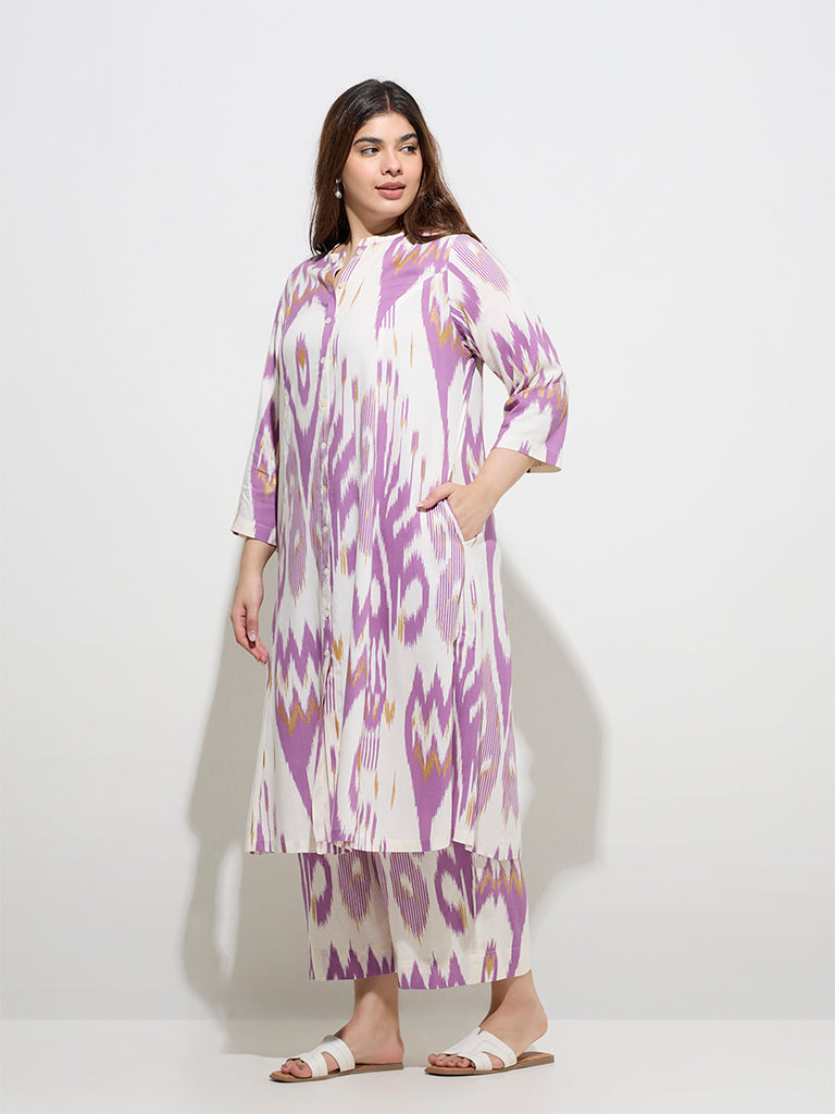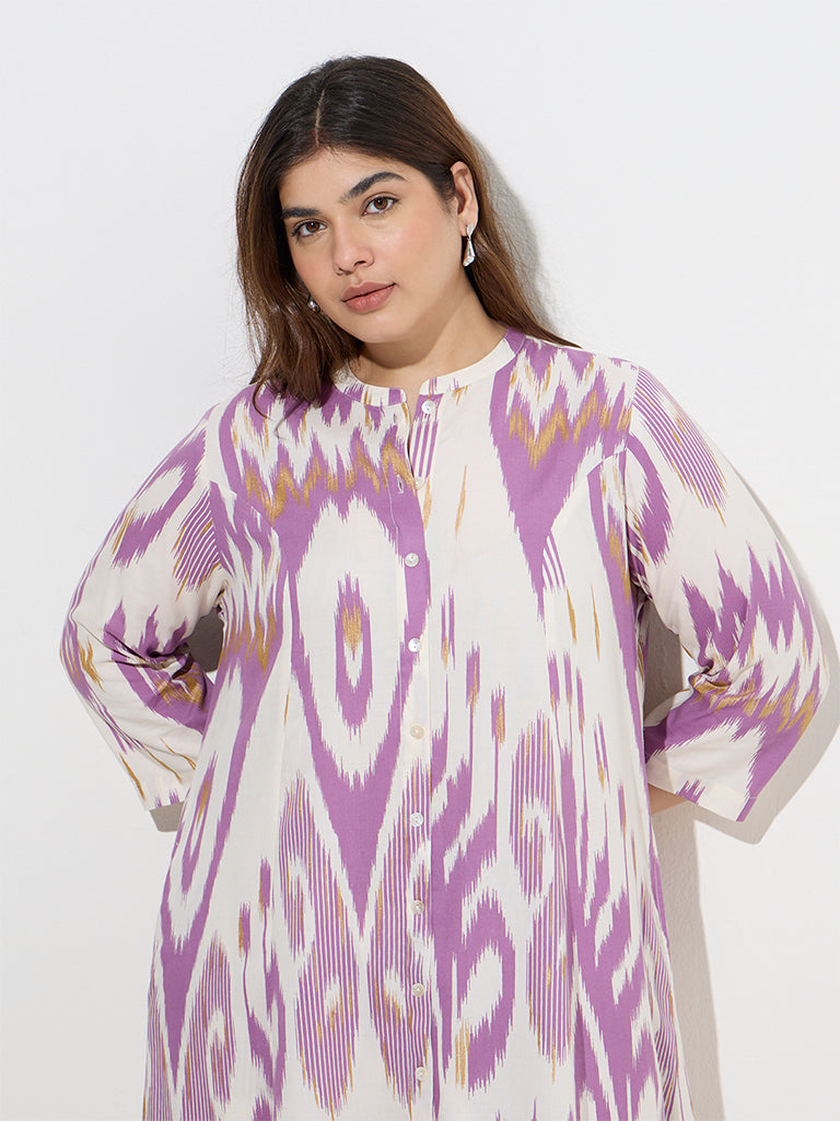 This purple kurta from Diza is highlighted with traditional Ikat motifs for a vibrant ethnic touch. Constructed from a breathable fabric. it’s carved in an A-line frame and features a band neck that extends to a button placket. and three-quarter sleeves for an effortlessly elegant look.