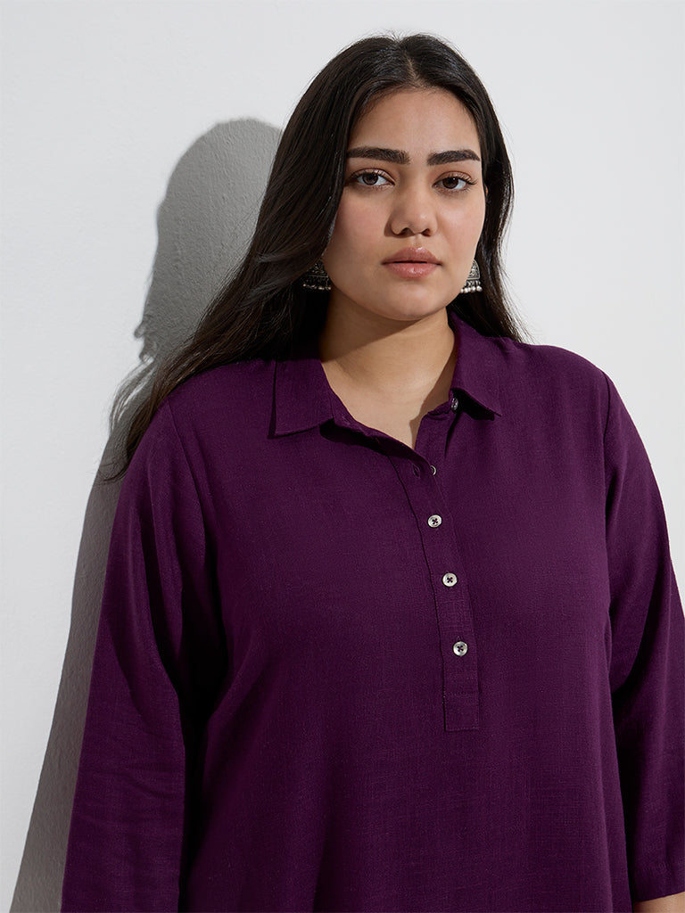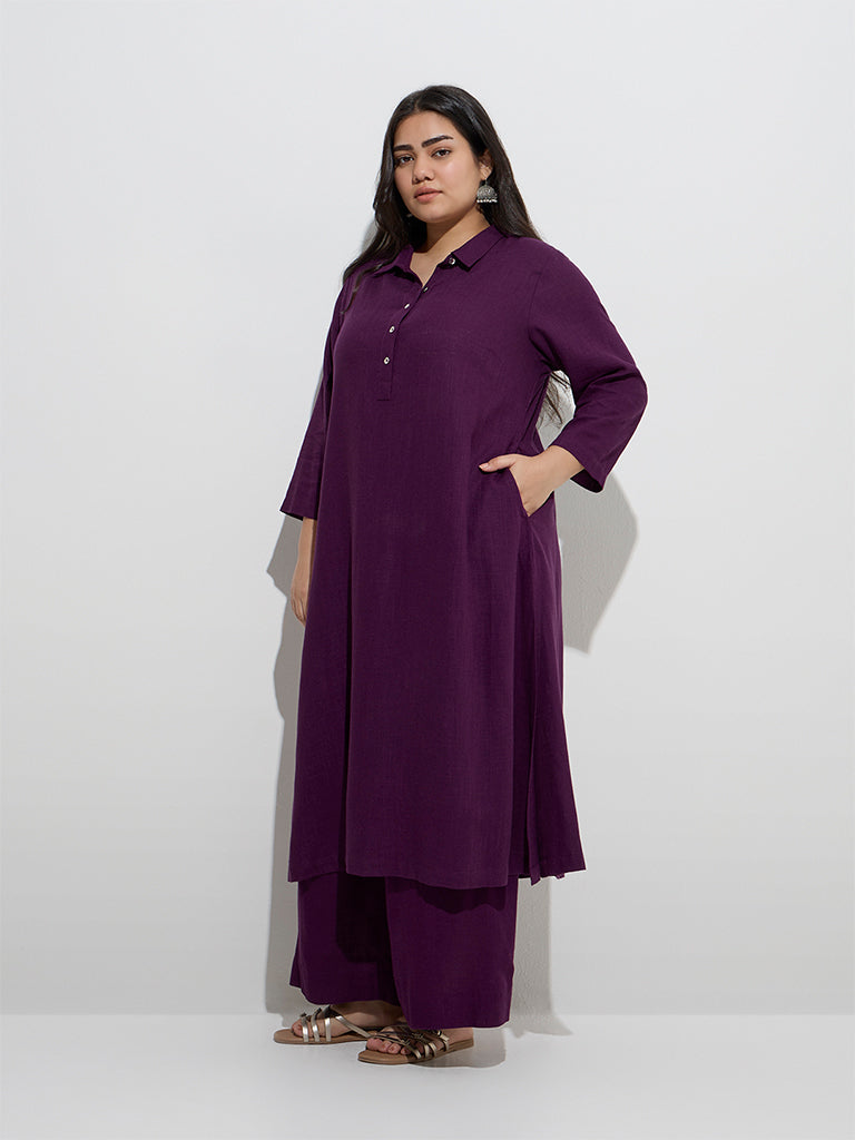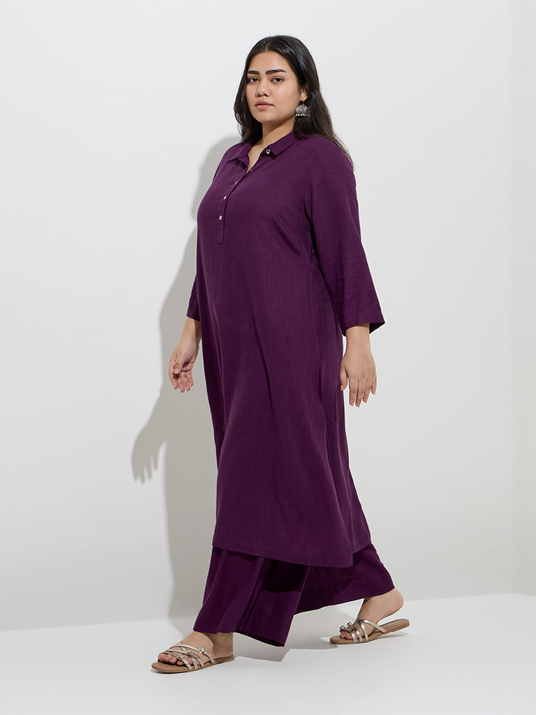 This purple kurta from Diza is crafted in a linen-blend fabric and cut to a flattering A-line silhouette. Designed with a spread collar. short buttoned placket and three-quarter sleeves. it combines clean lines with everyday ease. Functional side pockets complete the look with a practical touch.