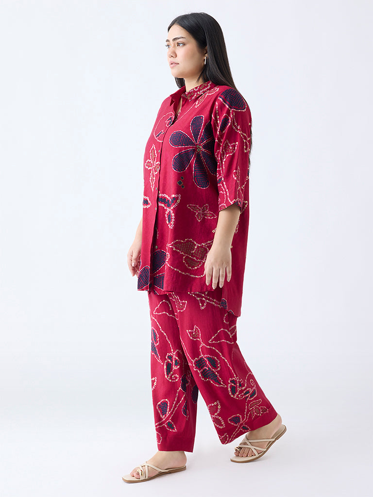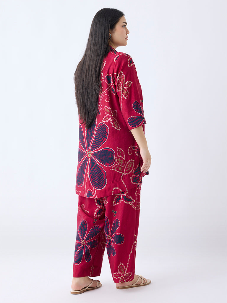 Give your ethnic rotation a modern twist with this red tunic from Diza. Flaunting bandhani-inspired floral prints. this high-low style gives a chic look with matching palazzos (sold separately)
