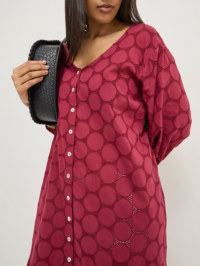 Diza launches this red dress featuring circular designs. The pure cotton garment offers a drop-waist silhouette. It carries a round neck leading to a button down style. puffed sleeves and side pockets.