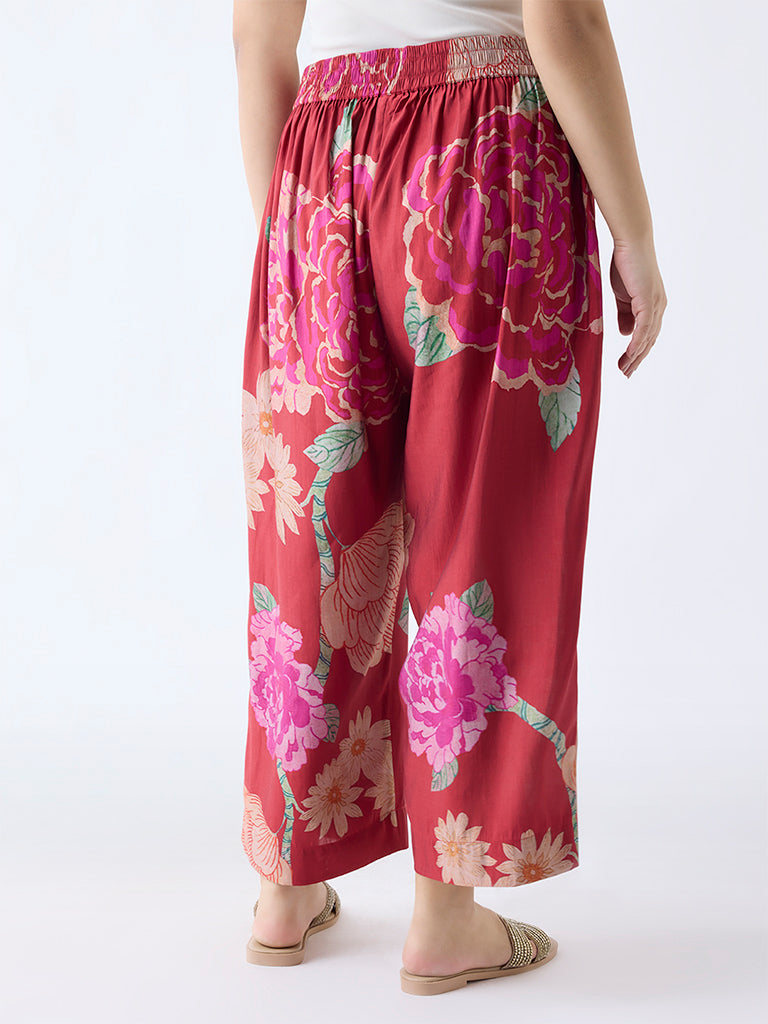 Bring a fresh twist to your festive look with these red ethnic pants from Diza. The oversized floral prints finessed with a soft. stretchy waistband offer both style and comfort. making them ideal for long hours of wear.