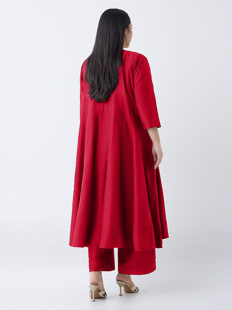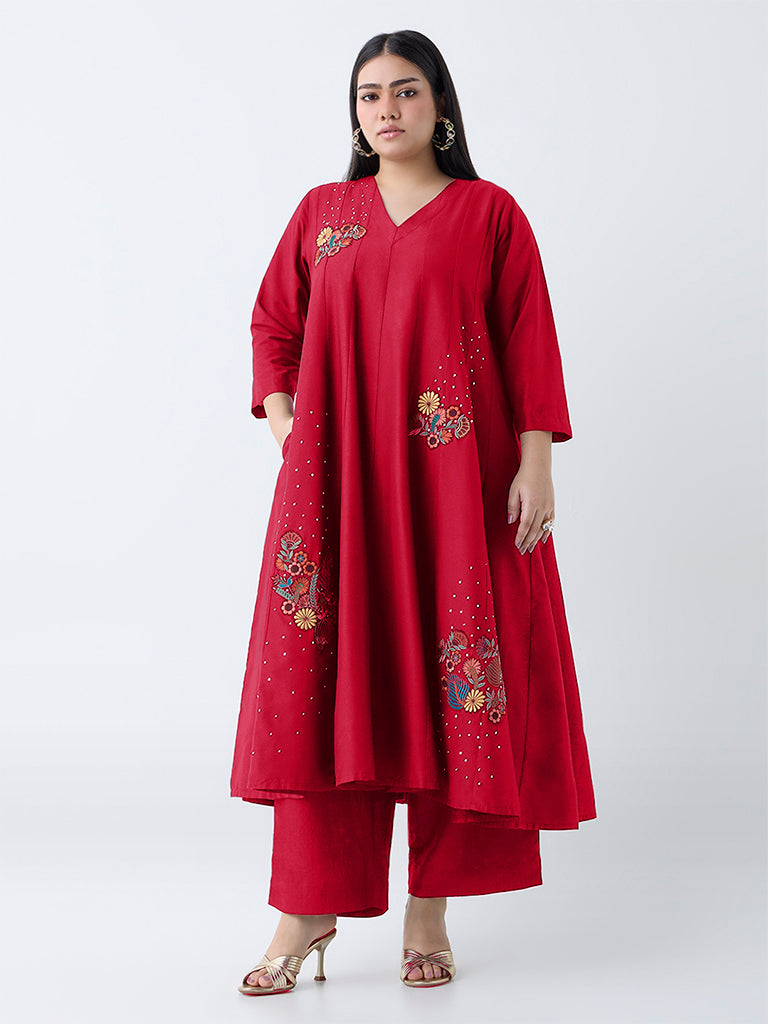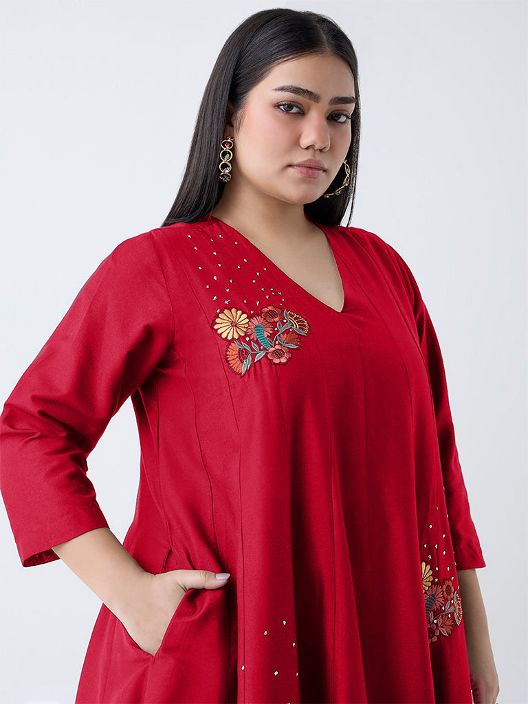 Infused with artisanal grace. this red kurta by Diza is detailed with floral embroidery and subtle embellishments for a festive sparkle. The Anarkali silhouette flows elegantly. balanced by a flattering V-neck and three-quarter sleeves. Side pockets add a modern touch of ease to this traditional design.