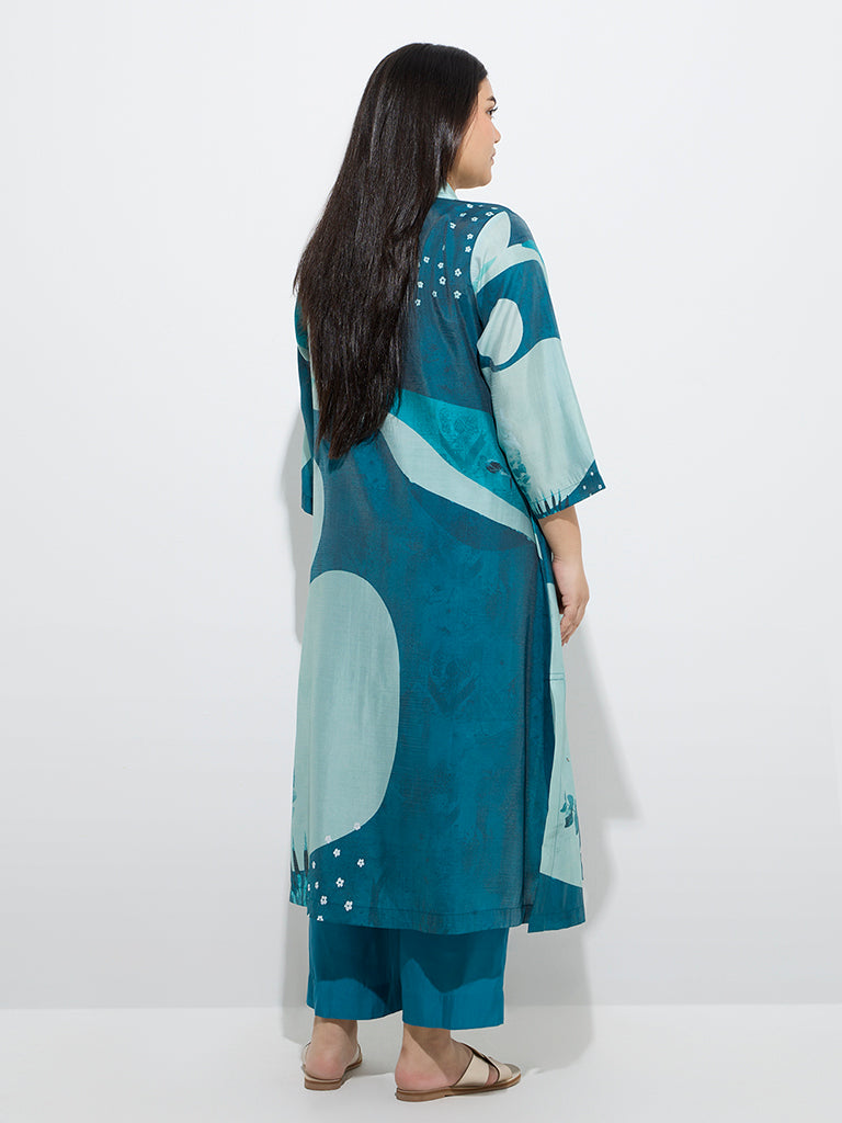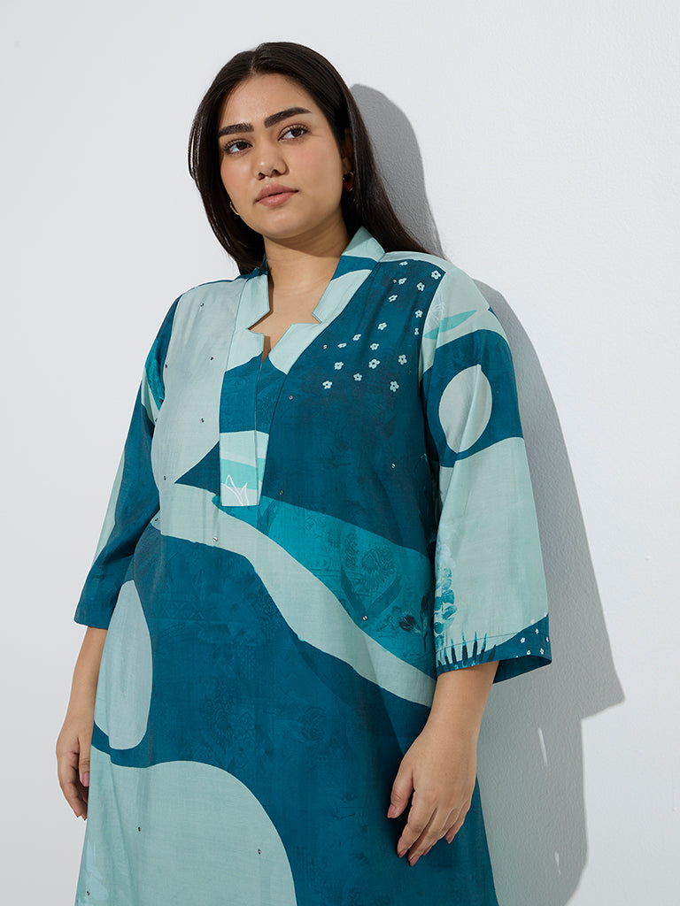 Defined with abstract prints. this teal kurta from Diza is sculpted in a flattering A-line silhouette. The lightweight fabric drapes effortlessly. while the asymmetrical neck and three-quarter sleeves add a modern touch. A discreet slip pocket enhances practicality. making this piece both stylish and functional.