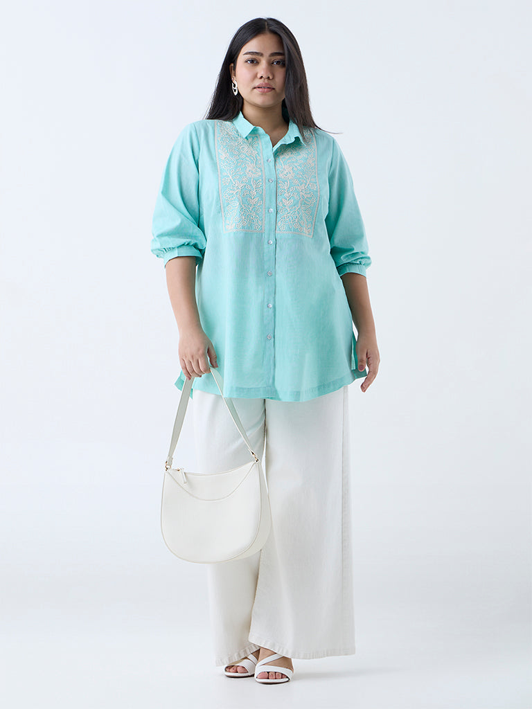 Diza Turquoise Floral Embroidered Cotton Tunic