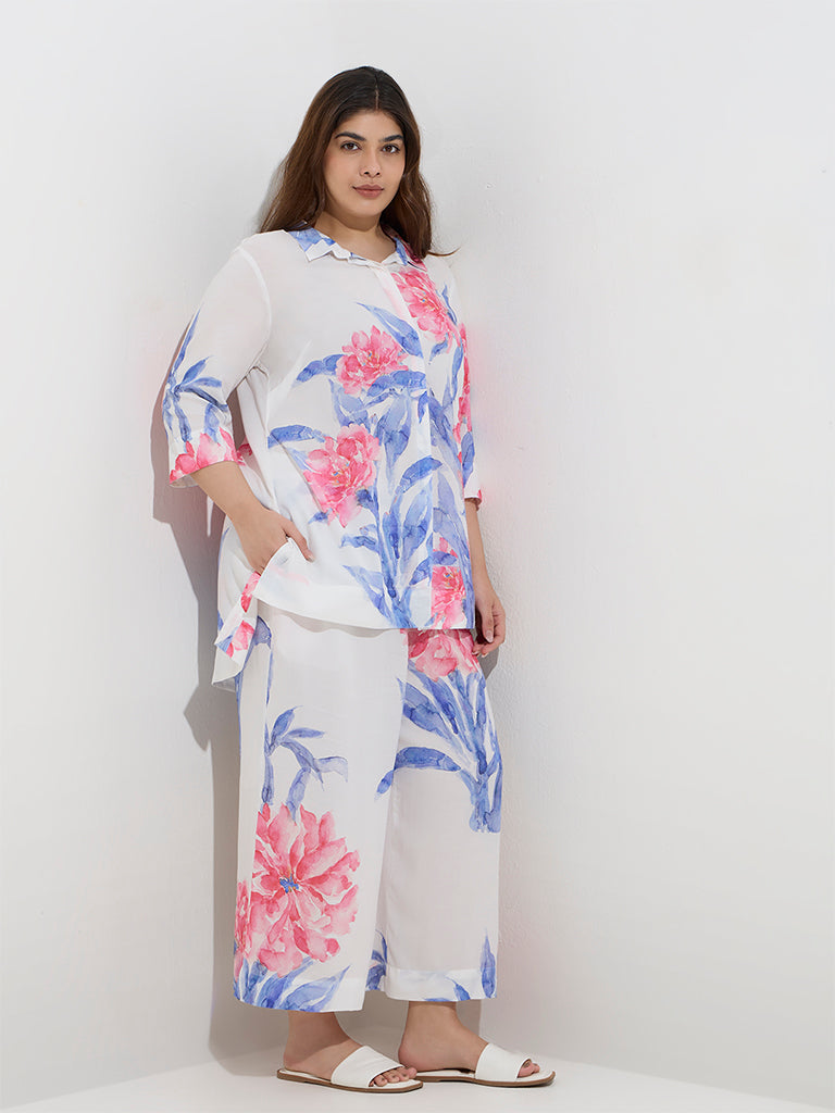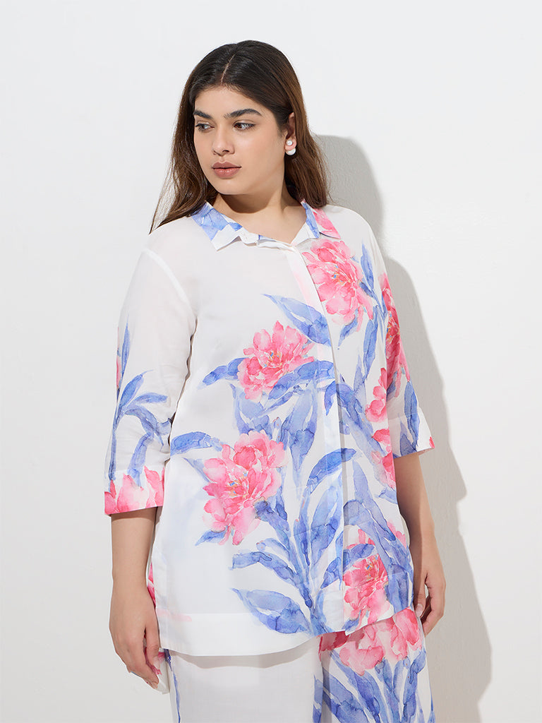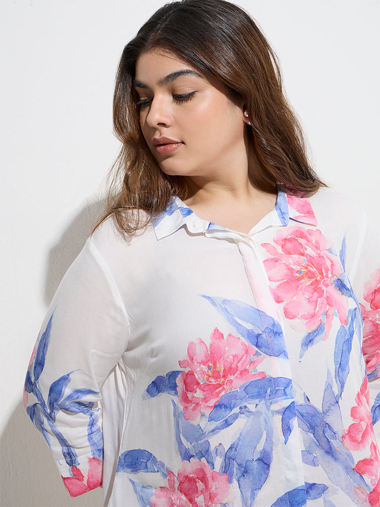 This white ethnic tunic from Diza is adorned with beautiful floral prints and crafted from a lightweight fabric for all-day comfort. It’s framed with a spread collar. a concealed button placket. and three-quarter sleeves for a graceful finish.
