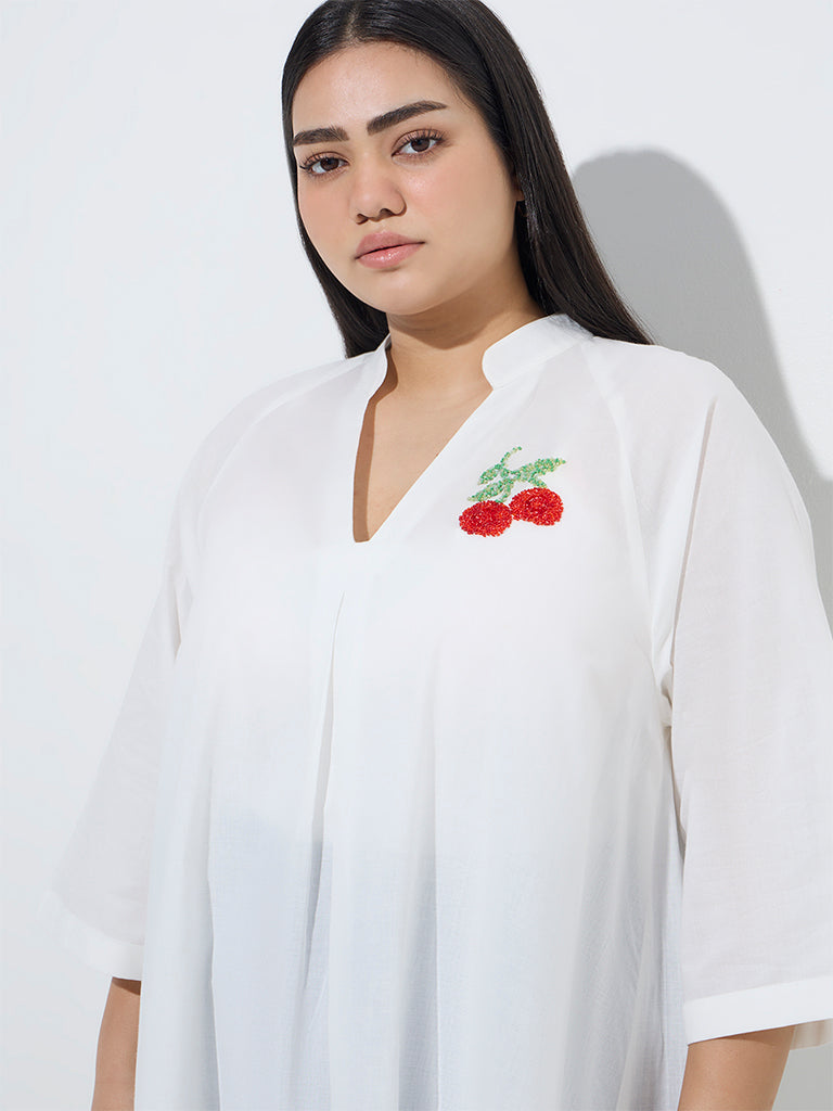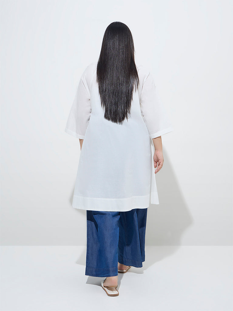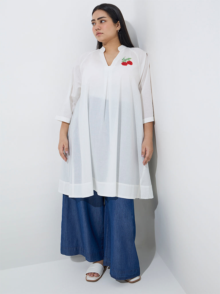 Diza introduces this white kurta. tailored in an A-line silhouette and crafted from a pure cotton fabric. A floral embellished motif highlights the design. while the notched V-neck and three-quarter sleeves complete the look with a refined touch.