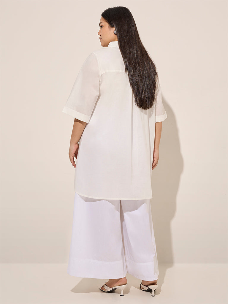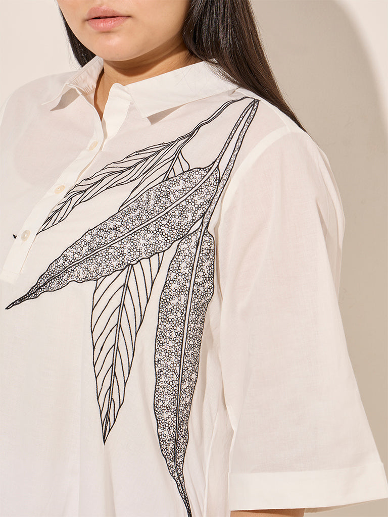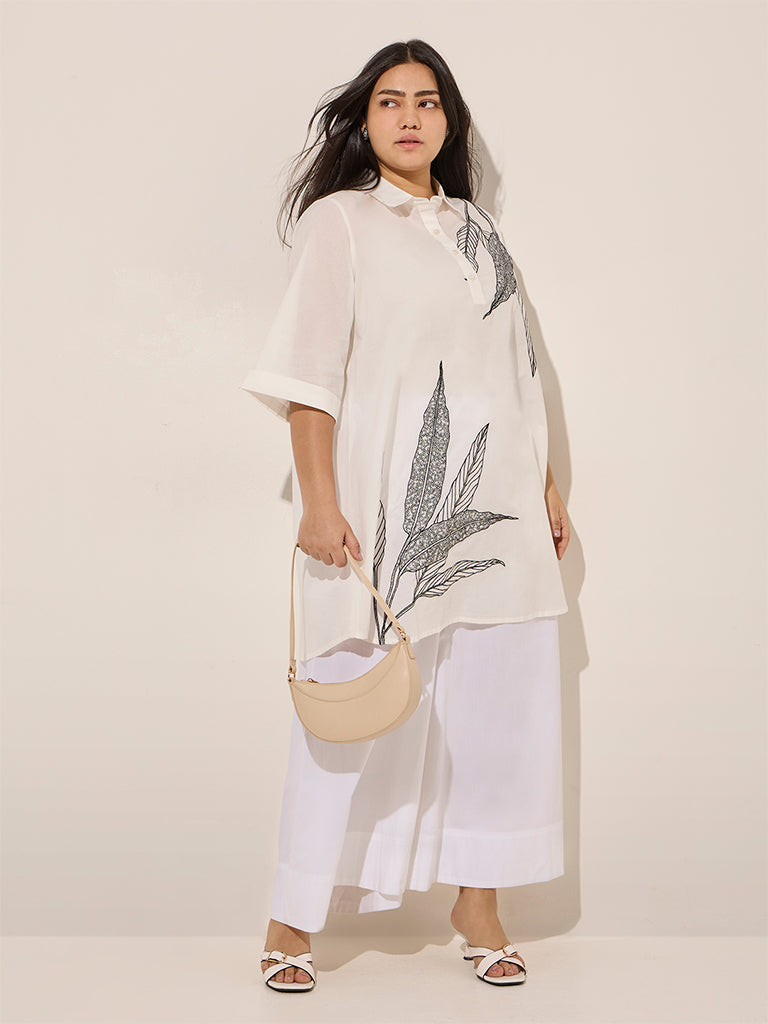 Diza brings you this white kurta featuring minimal foliage embroidery in a stylish asymmetrical silhouette. Made with quality fabric. it boasts a spread collar leading to a brief button down placket and three-quarter sleeves.