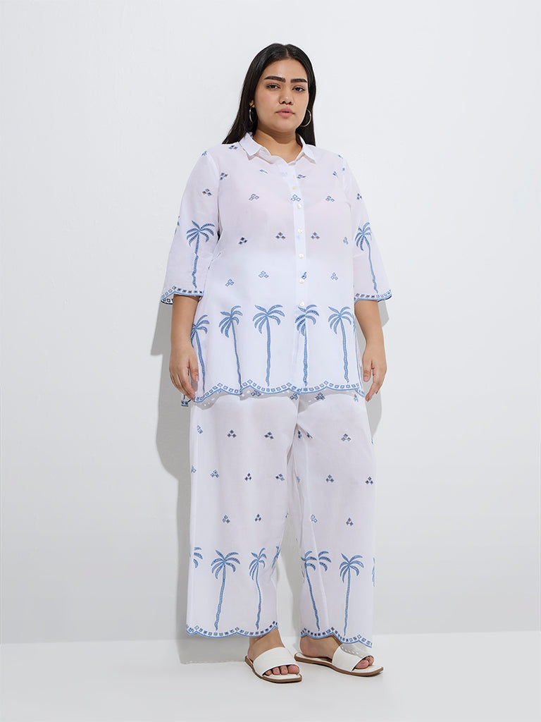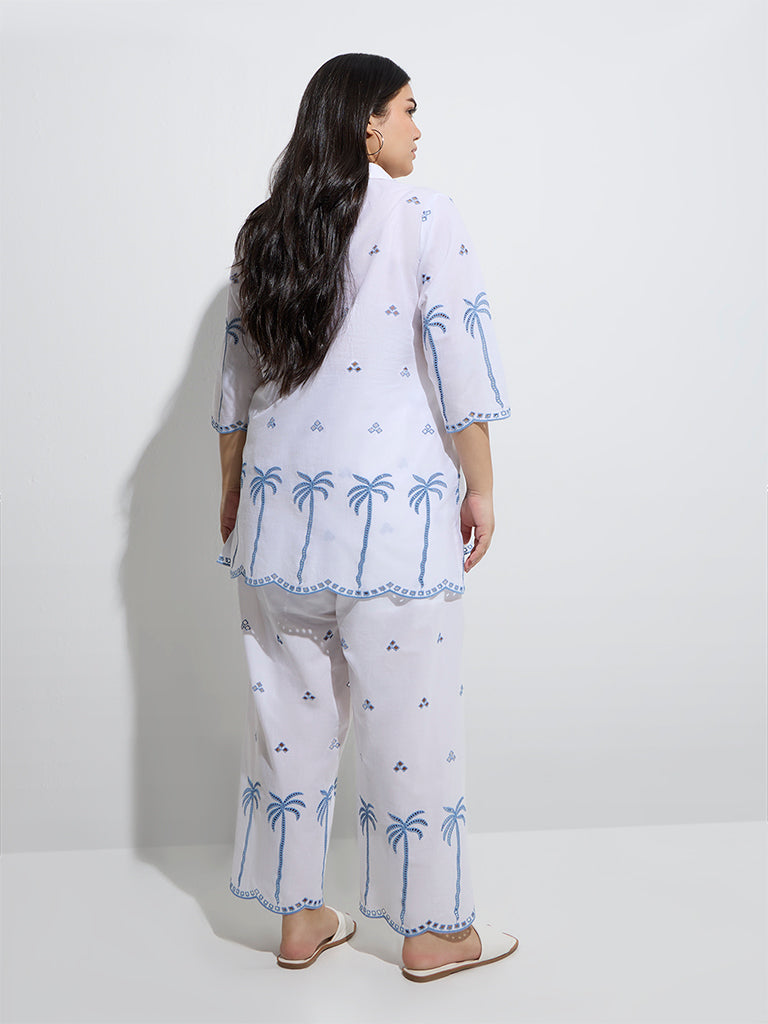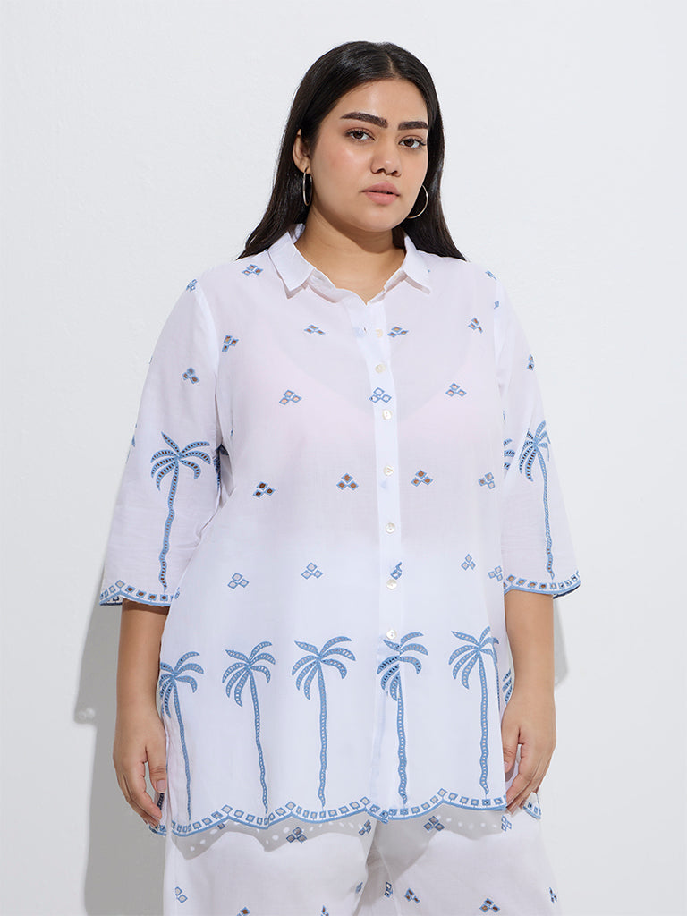 This white tunic from Diza is adorned with tropical-inspired motifs that lend a breezy. vacation-ready vibe. Made from a cotton-blend fabric. it features a spread collar and button placket for a polished look. while three-fourth sleeves offer everyday ease. The scalloped edges add a hint of delicate charm.