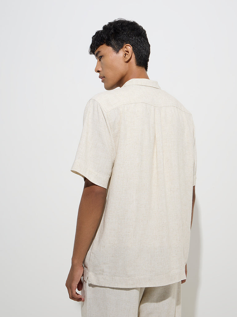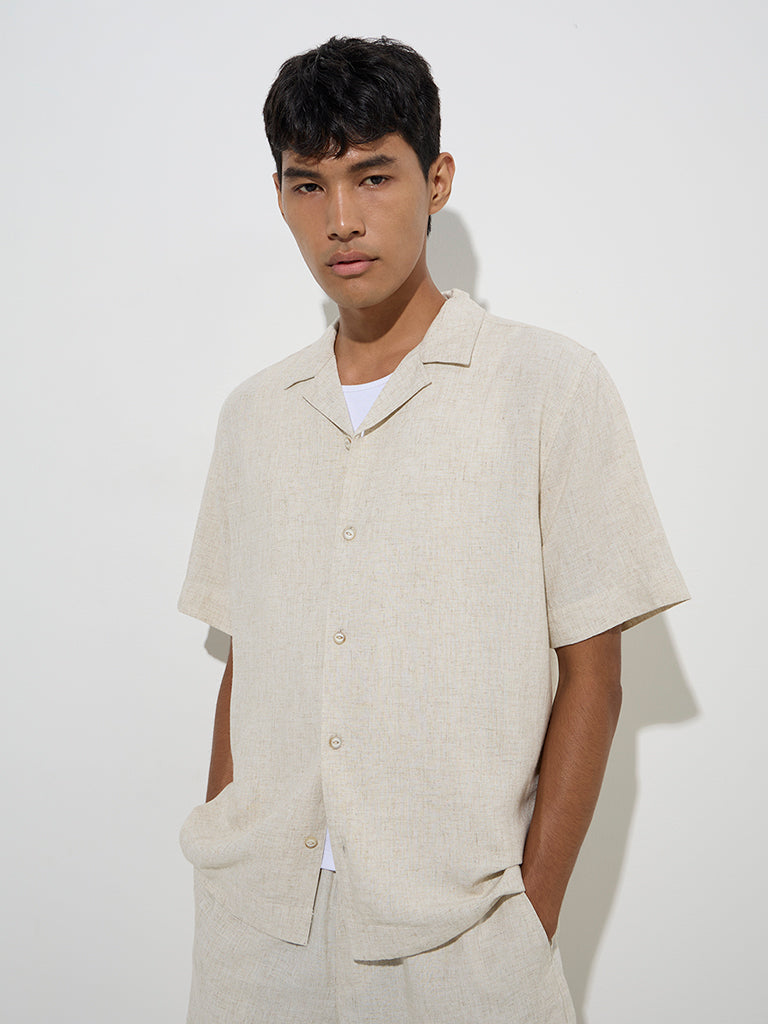 This beige shirt from ETA blends laid-back charm with refined style. Woven from a sumptuous cotton-linen blend. it’s tailored in a relaxed silhouette for supreme comfort. Finished with a camp collar. half sleeves. and a button placket. it’s a versatile pick for effortless dressing.