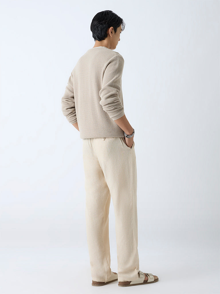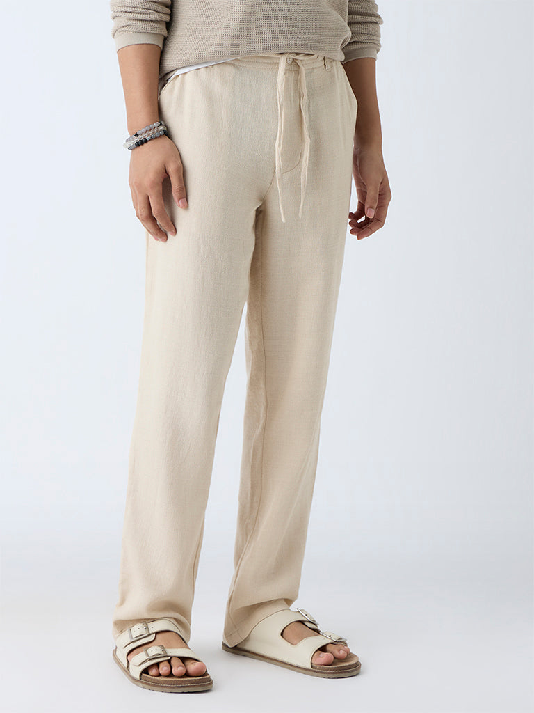 Bring sophisticated charm to your daytime assortment with these beige chinos from ETA. Cut in a relaxed fit. they feature a buttoned waistband with adjustable drawstrings. a zipper fly. and belt loops for a comfortable finish. Multiple pockets enhance functionality. while the soft cotton-blend fabric ensures all-day ease.