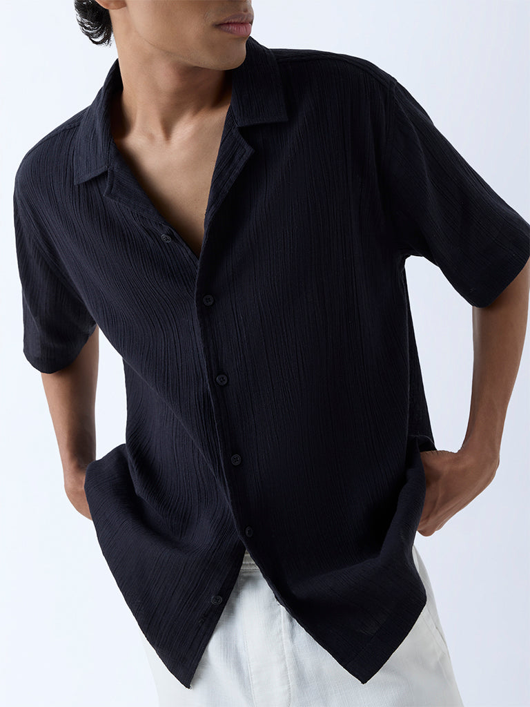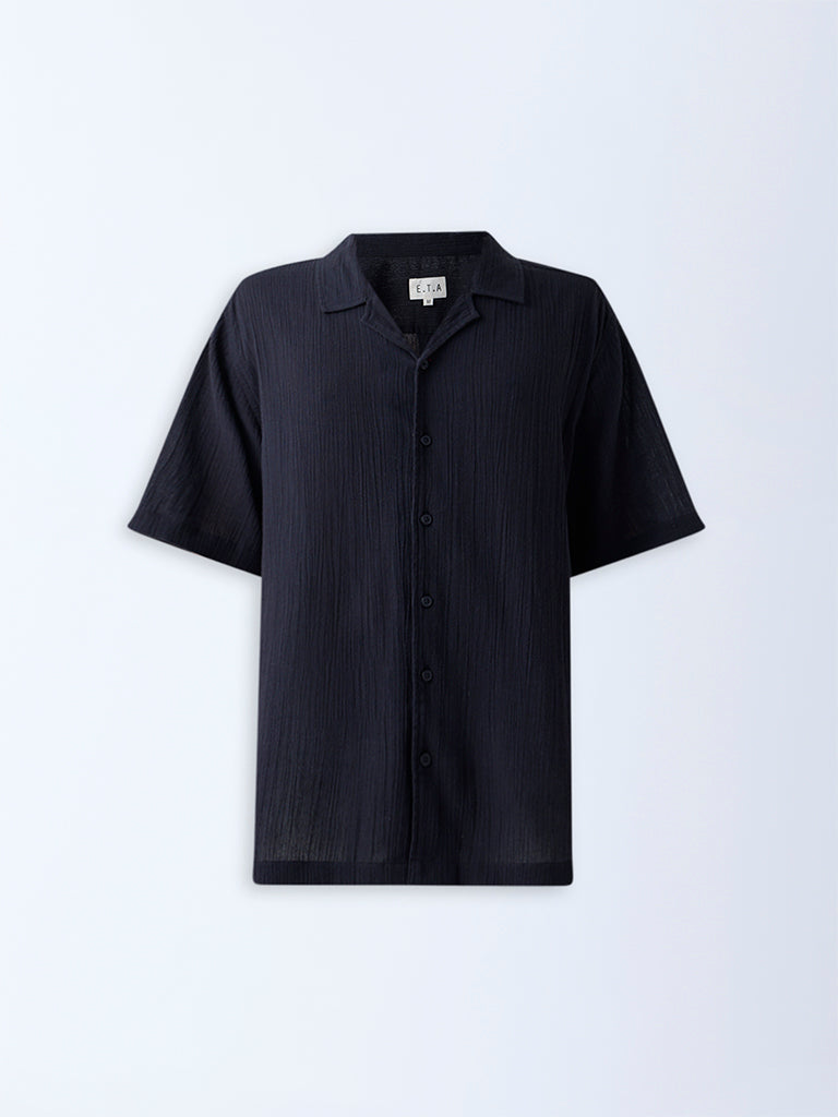 This black shirt from ETA is milled from pure cotton and finished with a subtle crinkle texture for understated character. Cut in a relaxed silhouette. it features a camp collar. half sleeves. and a button placket for easy wear.