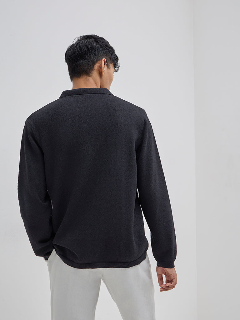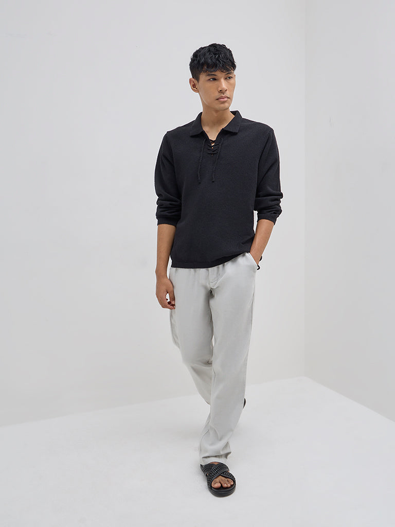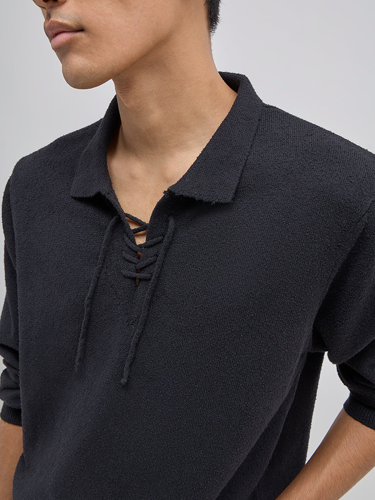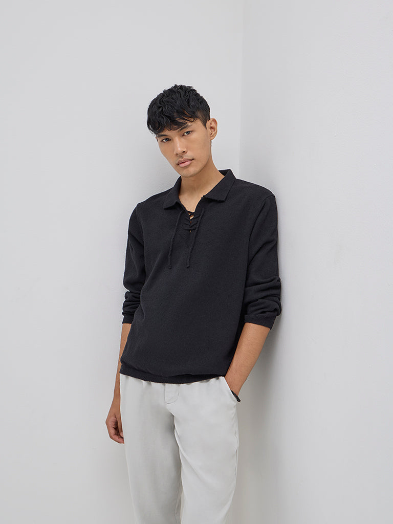 This black sweater from ETA is crafted in a relaxed frame for uninterrupted comfort. It features a collar that extends to a criss-cross design and full sleeves.