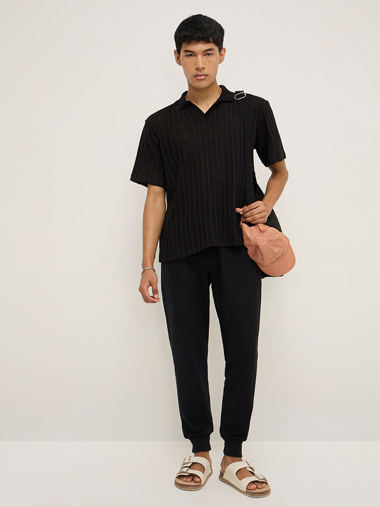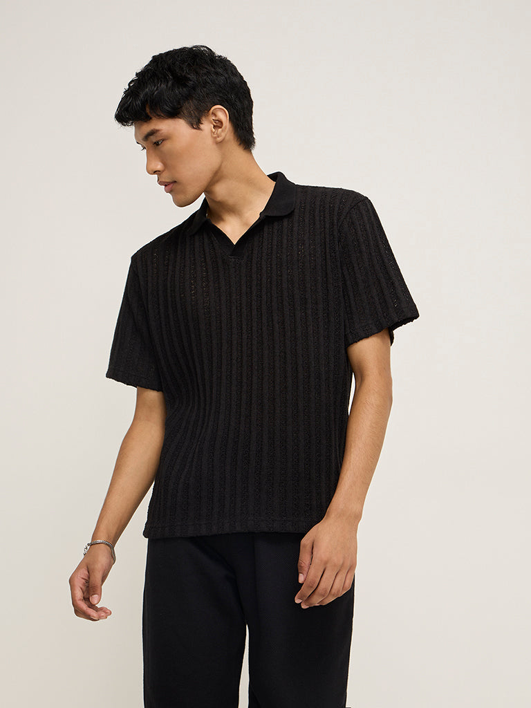 ETA Black Knit-Textured Relaxed-Fit Polo T-Shirt