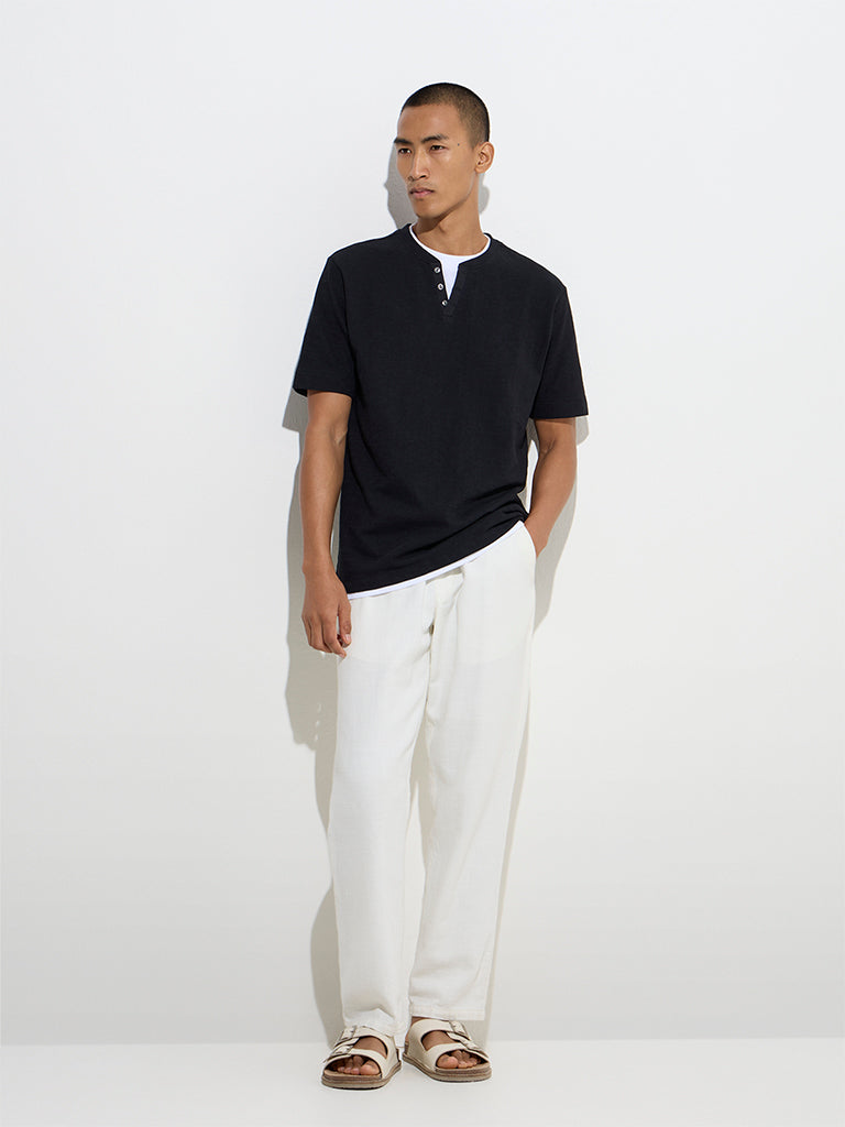 Tailored in a slim-fit silhouette. this black t-shirt from ETA will amplify your weekend edit. Its pure-cotton composition renders superior comfort. while the contrast notched neckline and short sleeves complete it.