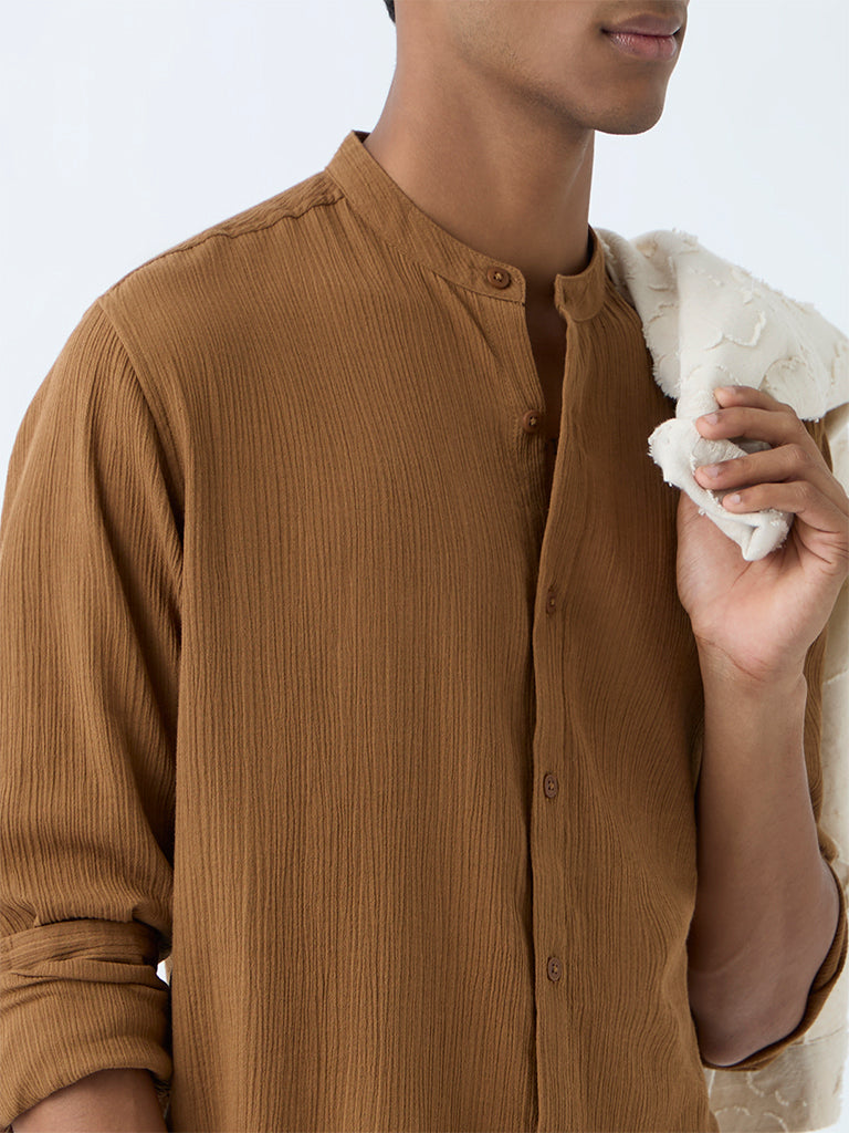 Upgrade your daytime assortment with this brown shirt from ETA. Constructed from a crinkle-textured fabric. it’s tailored in a relaxed silhouette for enhanced comfort. A mandarin collar. button-down front. and full sleeves complete the look.