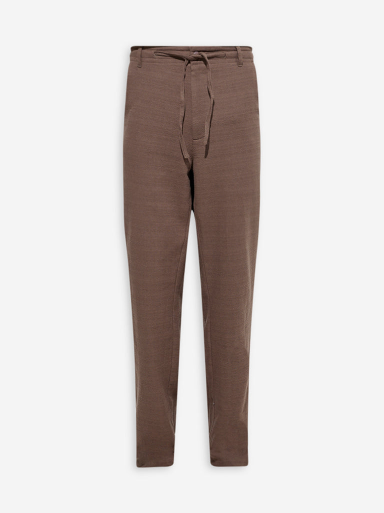 These brown chinos from ETA are woven from a cotton-blend fabric for optimal comfort. Structured in a relaxed frame. they feature an elasticated waistband. button closure. zipper fly. belt loops. and adjustable drawstrings. Finished with multiple pockets. this versatile pair brings both poise and practicality to casual styling.