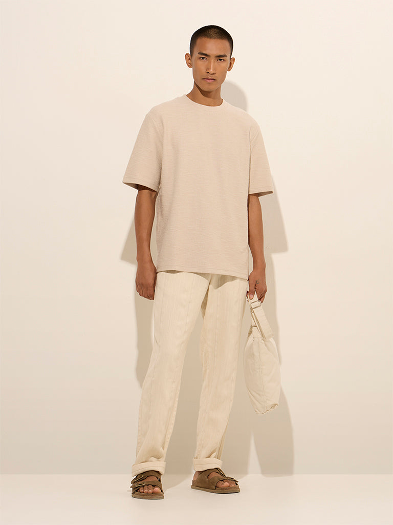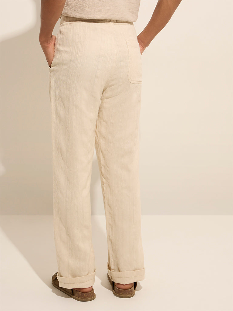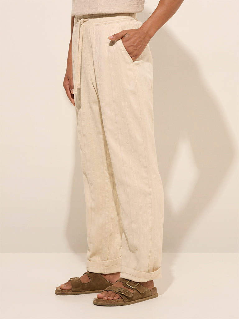 ETA introduces these cream chinos. showcasing a self-patterned design. Crafted from a cotton-rich fabric. they offer a comfortable mid-rise fit and a relaxed silhouette. Featuring an elasticated drawstring waistband and functional side pockets. these chinos combine practicality with effortless charm.