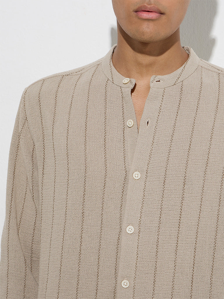 Bring earthy tones to your wardrobe with this dark beige shirt from ETA. Made from pure cotton in a relaxed fit. it features subtle stripe detailing. a band collar. full sleeves. and a button-down front ?? ideal for effortless everyday style with a refined edge.