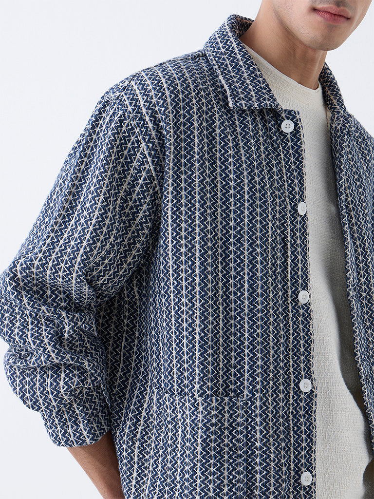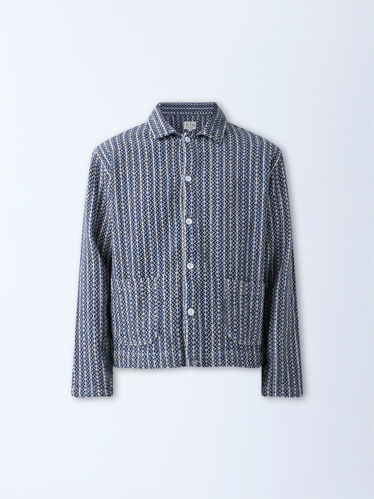 This indigo cotton jacket from ETA blends craftsmanship with everyday ease. Designed in a relaxed fit. it features intricate embroidery that adds a refined touch. along with a spread collar. button-down front. full sleeves. and a functional front pocket for a timeless. versatile appeal.