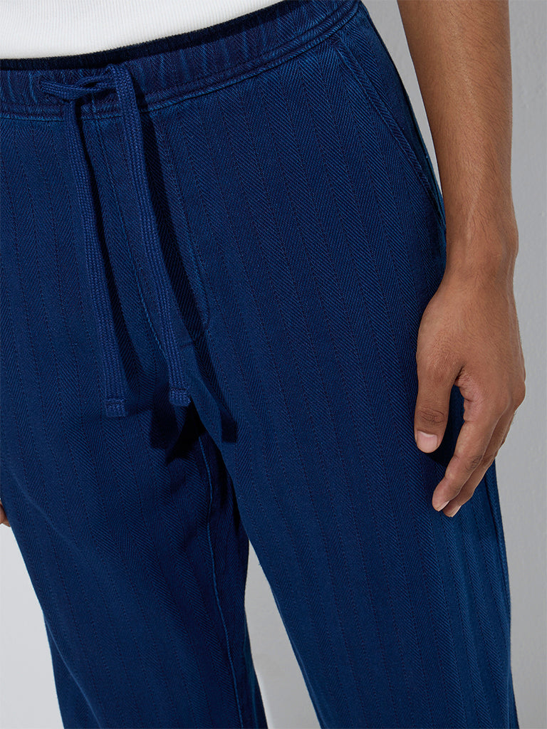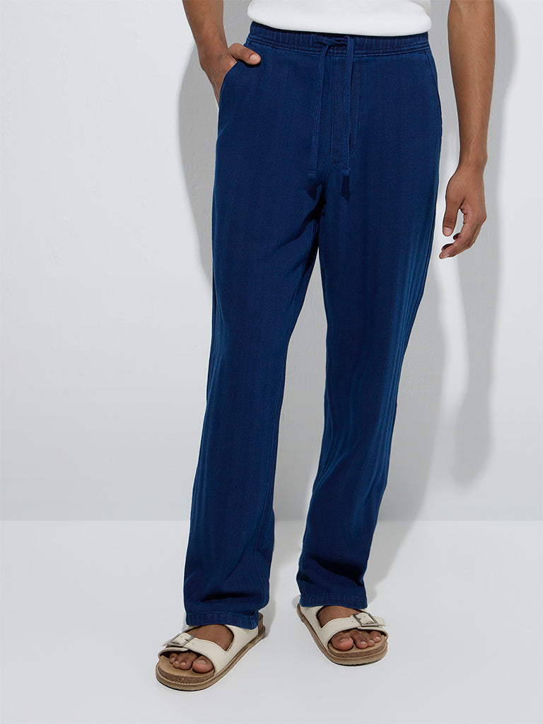 ETA offers these indigo chinos in a minimalist profile. Tailored from pure cotton in a relaxed fit. they feature an elasticated waistband. adjustable drawstrings. and multiple pockets for added utility.