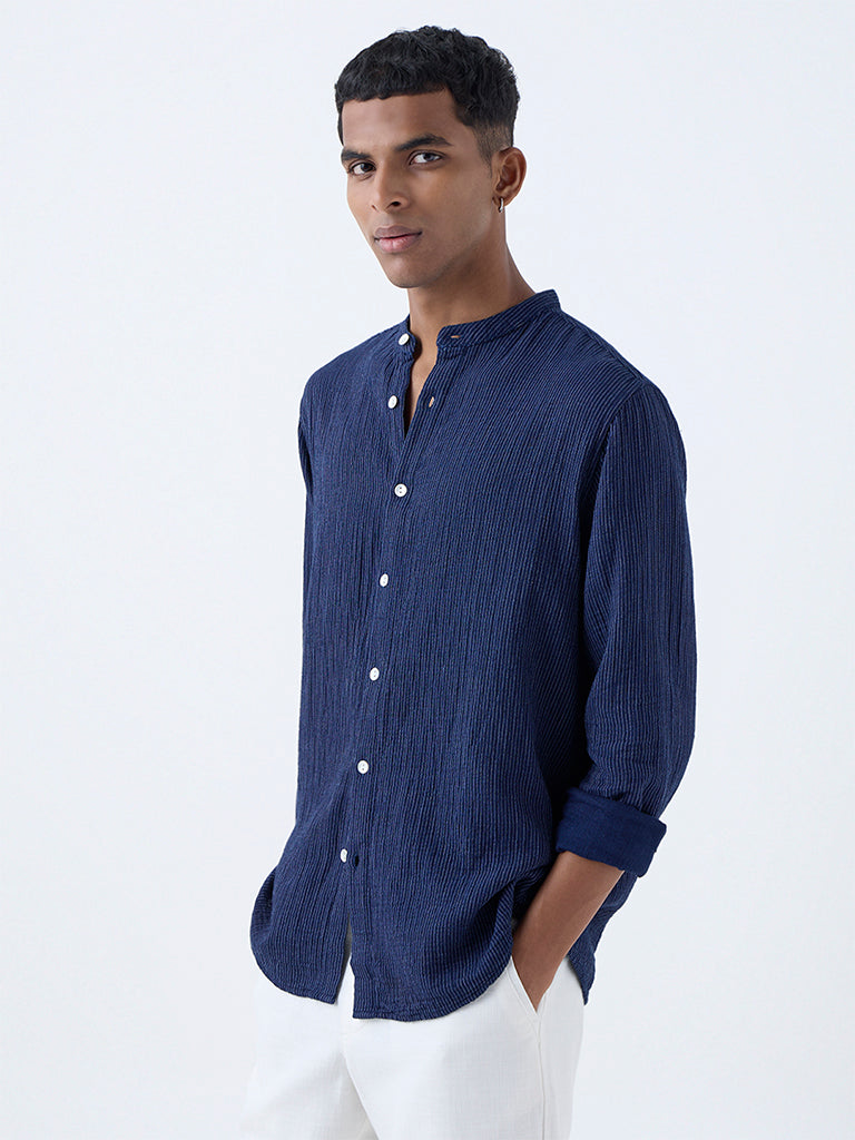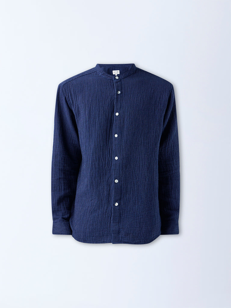 Smart. effortless. and versatile. this indigo striped shirt from ETA is crafted from breathable cotton for all-day comfort. The relaxed fit. band collar. button-down front. and full sleeves give it a refined yet easy-going edge. Ideal for pairing with chinos or denim. it’s a go-to off-duty staple for casual city style.