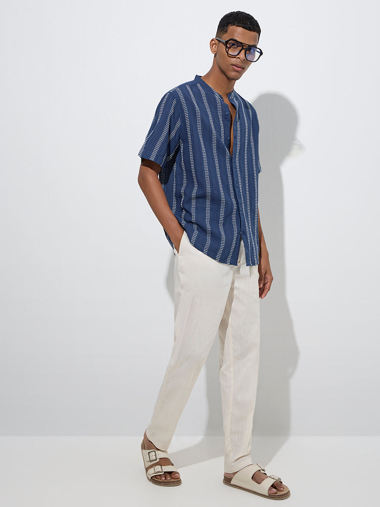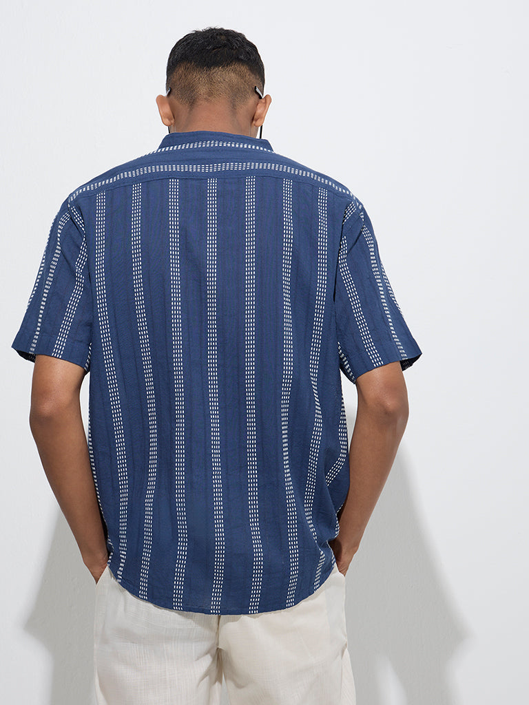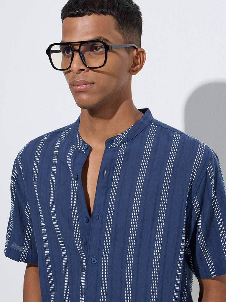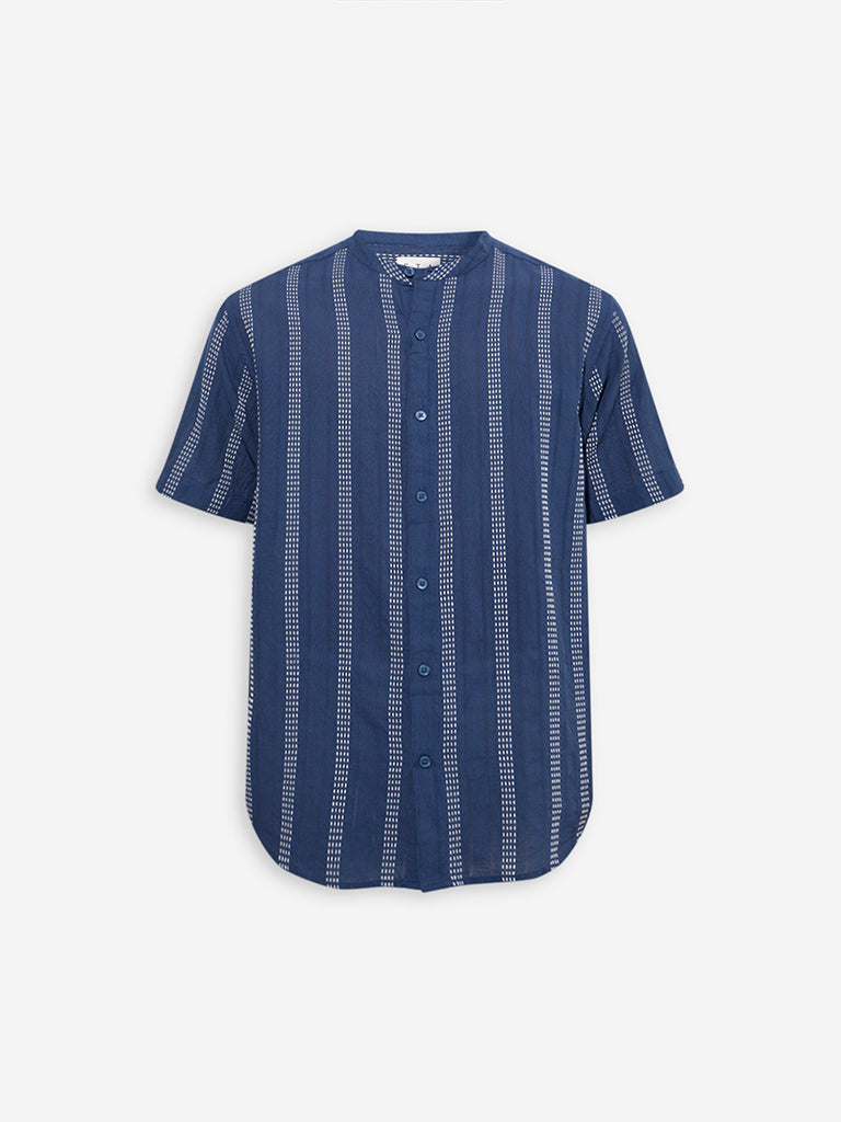 Embroidered with stripe patterns. this indigo shirt from ETA offers a refined yet casual appeal for warm-weather dressing. Spun from a cotton-rich fabric in a relaxed silhouette. it is styled with a mandarin collar. button placket. and half sleeves for everyday comfort.