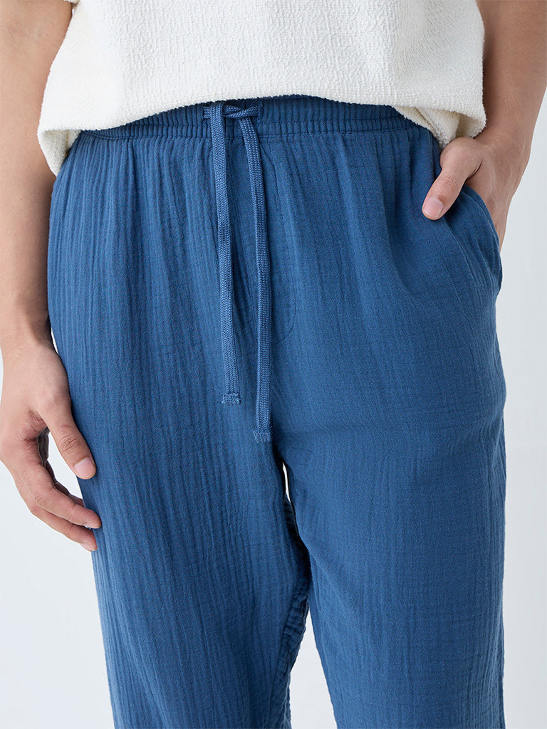 Made for easy days and everyday plans. these indigo trousers from ETA combine comfort with considered style. Spun from pure cotton in a relaxed fit. they feature an elasticated waistband with adjustable drawstrings for a personalised fit. Finished with multiple pockets. they bring practicality to the forefront without compromising on ease.