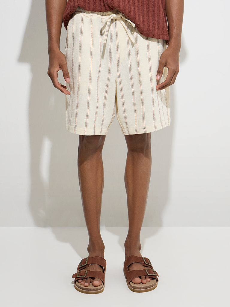 ETA Light Beige Striped Relaxed-Fit Mid-Rise Cotton Shorts