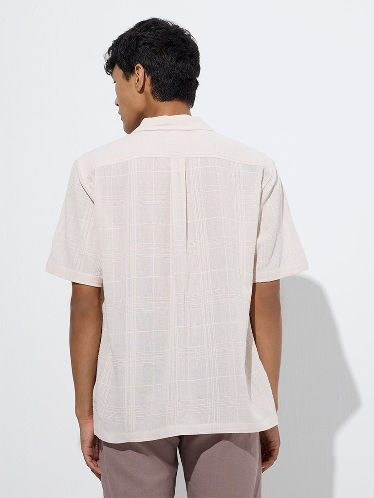 ETA introduces this light pink shirt combining floral embroidery with a subtle checkered design for a refined touch. Featuring a relaxed frame with a camp collar. button placket. and half sleeves. it is crafted from pure cotton for breathable ease and all-day comfort.